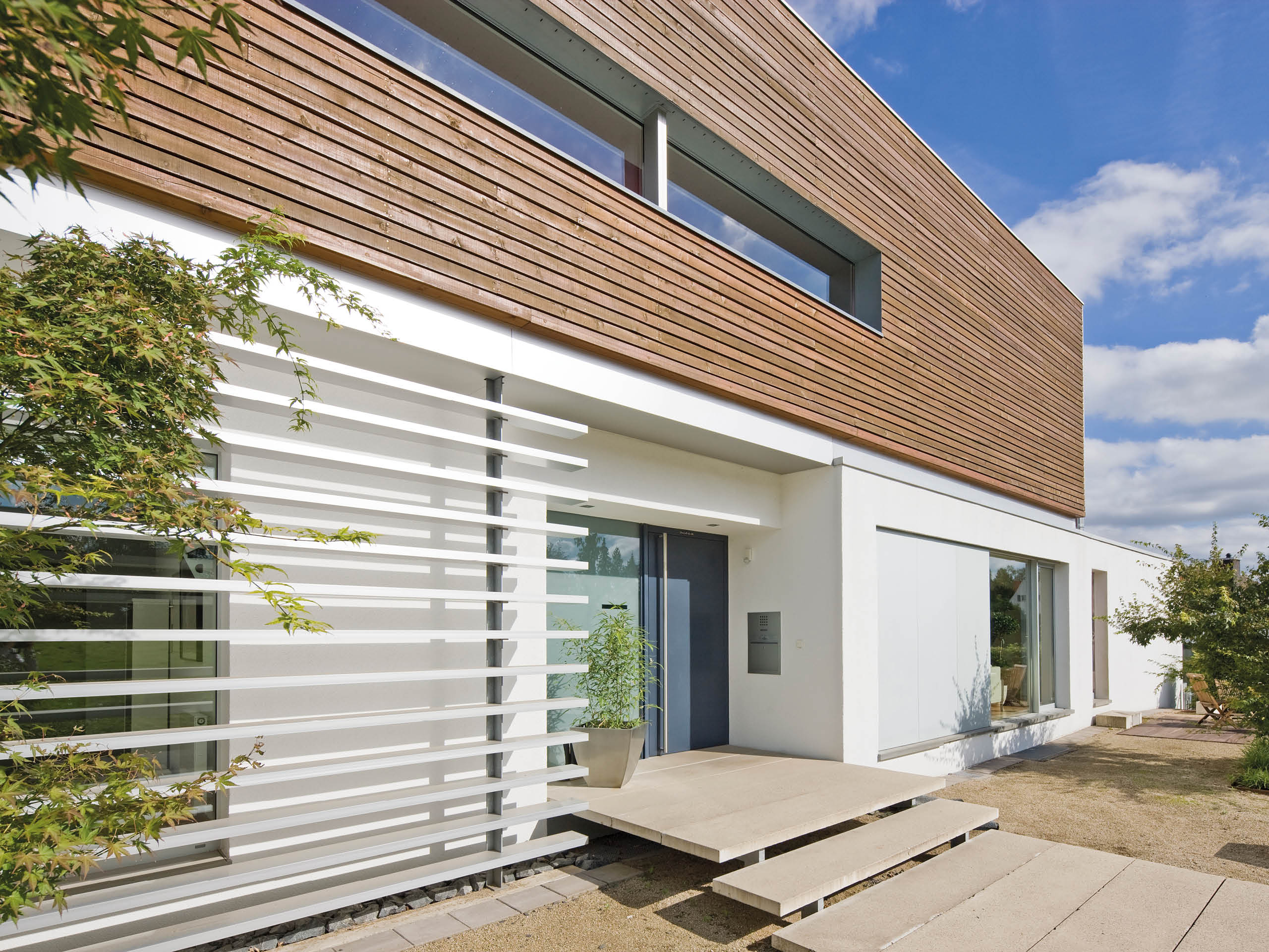 - Fassaden von Anbau und Altbau unterscheiden sich: Anbau mit Holzfassade, Altbau mit schlichter weißer Fassade