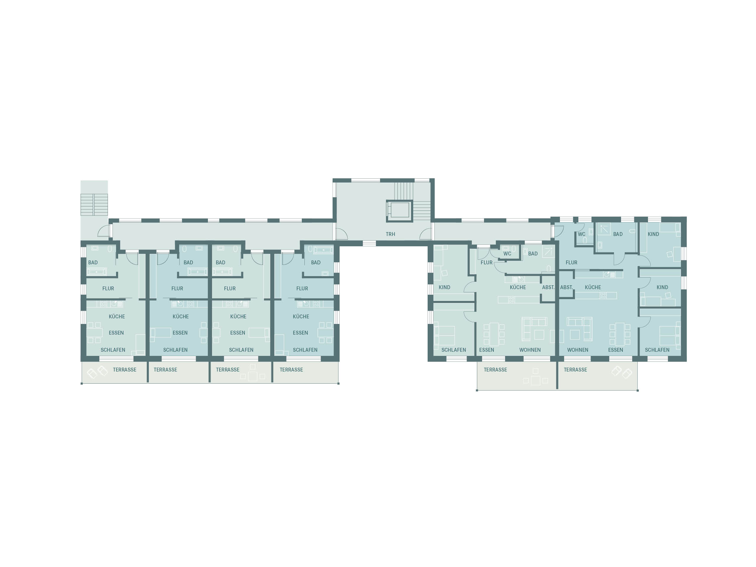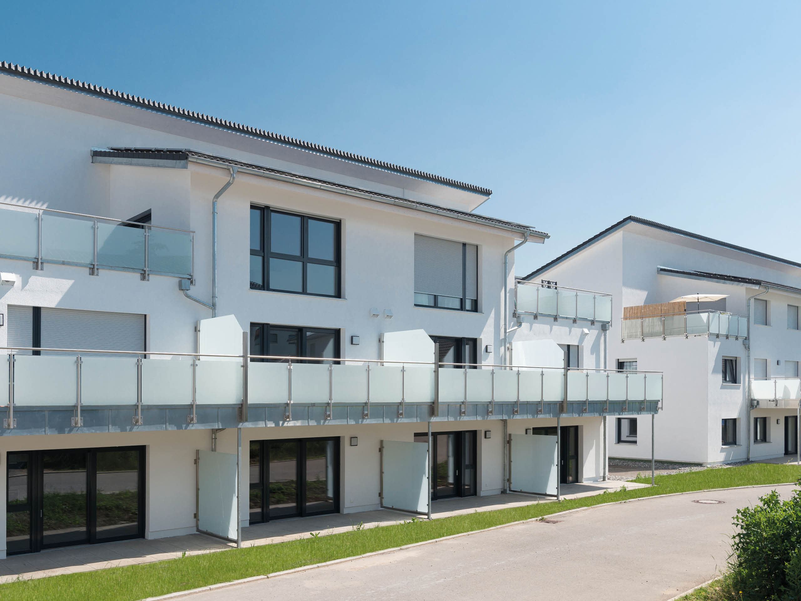 Optisch überzeugt der Komplex durch das moderne Pultdach und die zurückversetzten Balkone. Die hochgedämmte Gebäudehülle trägt entscheidend zur hervorragenden Energiebilanz des Effizienzhauses bei und sorgt für optimales Wohlfühlklima in allen Räumen. Im westlichen Gebäudeteil finden sich hauptsächlich Ein-Zimmer-Appartements mit rund 47 Quadratmetern, während der östliche Teil mit größeren Wohnungen, zwischen 62 und 120 Quadratmetern, ausgestattet ist. Beide Hälften sind barrierefrei miteinander verbunden, was gleichermaßen beste Voraussetzungen für das Zusammenleben mehrerer Generationen schafft. Aber auch vollkommen ohne Zweckbindung ist der Neubau ein reizvolles Wohndomizil.
