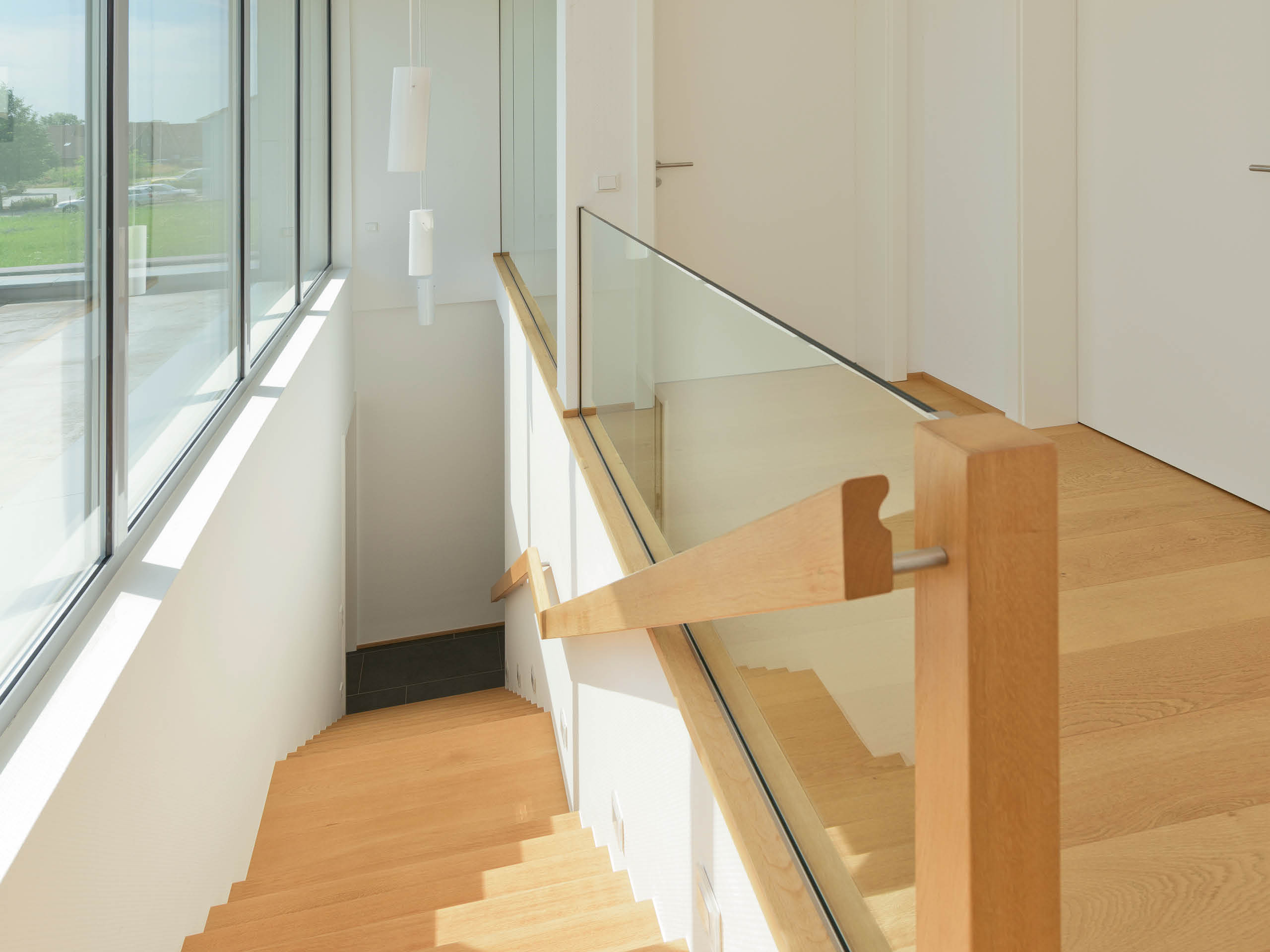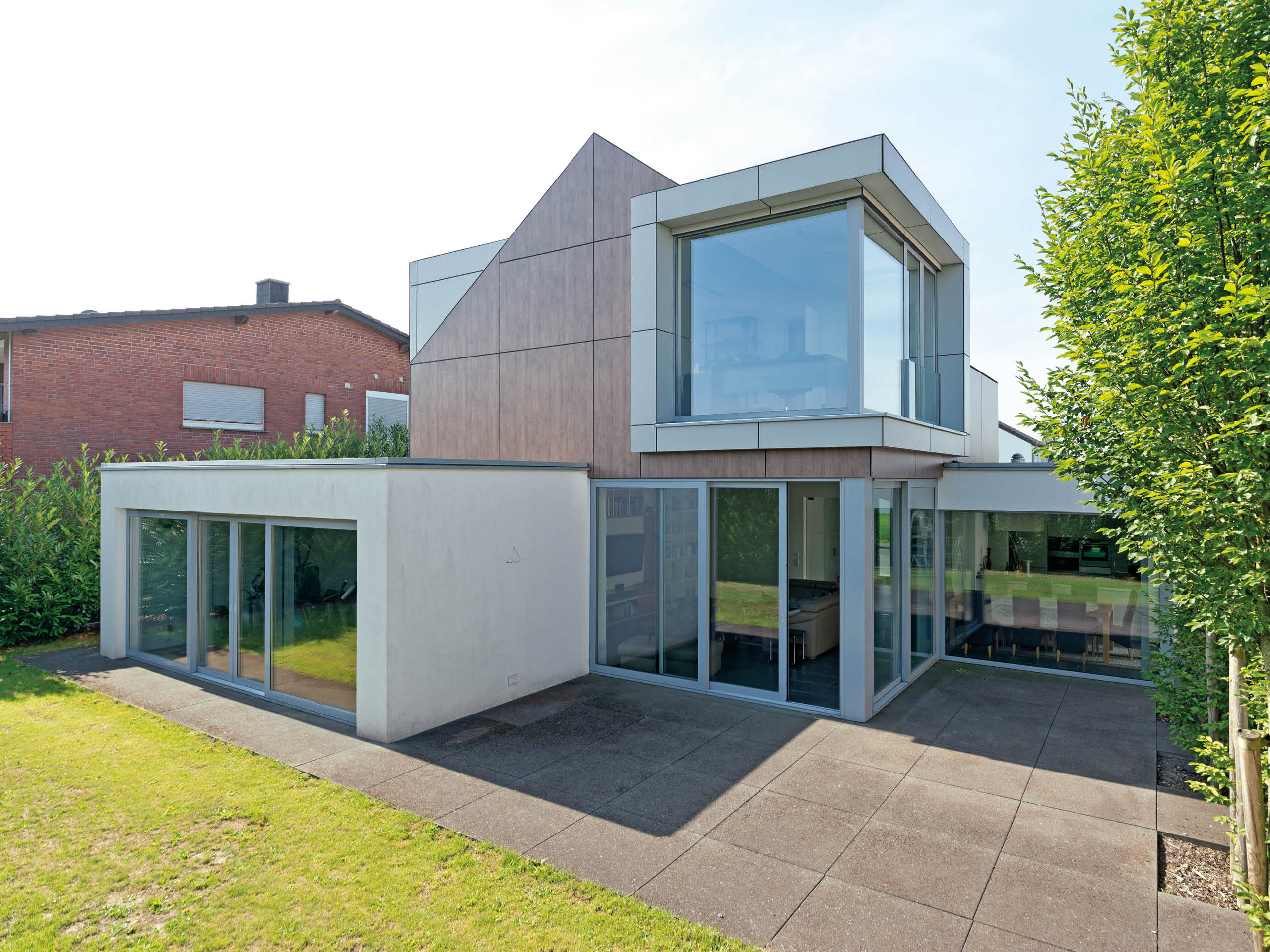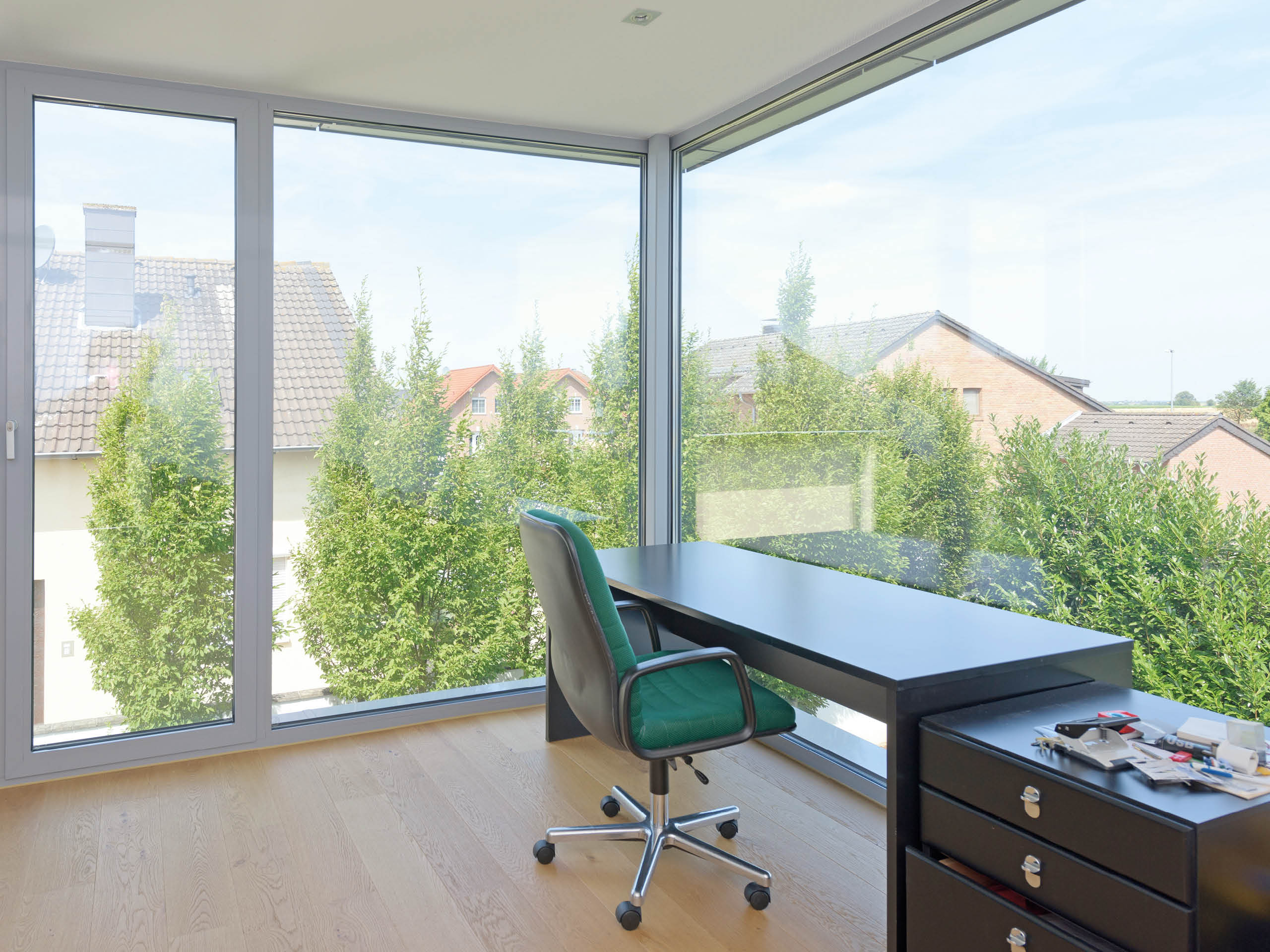 Das futuristisch anmutende Gebäude ist durch die Kombination von Satteldach und kubischen Anbauten gekennzeichnet. Unterstrichen wird die markante Optik durch die weiße Putzfassade, Trespaplatten in Holzoptik und mehrfach übereck laufende Glasfassaden. Bei allen architektonischen Highlights konnte, aufgrund der ausgeklügelten Holzkonstruktion, die Statik gewahrt werden. Die besonders platzschaffende Bauweise sorgt im Inneren für Luftigkeit und Weite. In einer der beiden Gauben, welche die Dachfläche in Richtung Garten öffnen, entstanden durch die raumhohe Übereckverglasung zwei lichtdurchflutete Arbeitsräume.