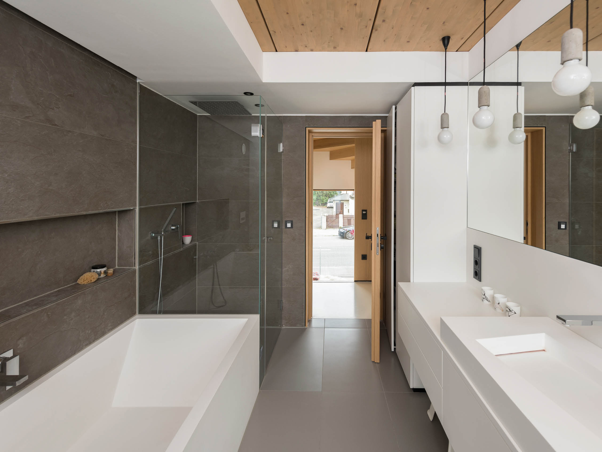 Während die Lochfassade zur Straße hin für einen optimalen Schallschutz nur sparsam unterbrochen wird, öffnet sie sich auf der Rückseite mit einer üppigen Übereckverglasung zum Garten hin. Im Inneren begegnet die Klarheit klassischer japanischer Architektur der Behaglichkeit warmer Naturtöne. Schranktüren verschwinden grifflos in der Fläche und passen sich so dem minimalistischen Lebensstil der Baufamilie an. Trotz der Grundstücksknappheit in der Region kann Familie Brandt maximalen Wohnkomfort genießen – denn wie Christoph Brandt schnell erkannte, liefert eine schlanke Holzkonstruktion bei gleichem Dämmwert deutlich mehr Wohnfläche als ein Mauerwerk plus Zusatzdämmung.