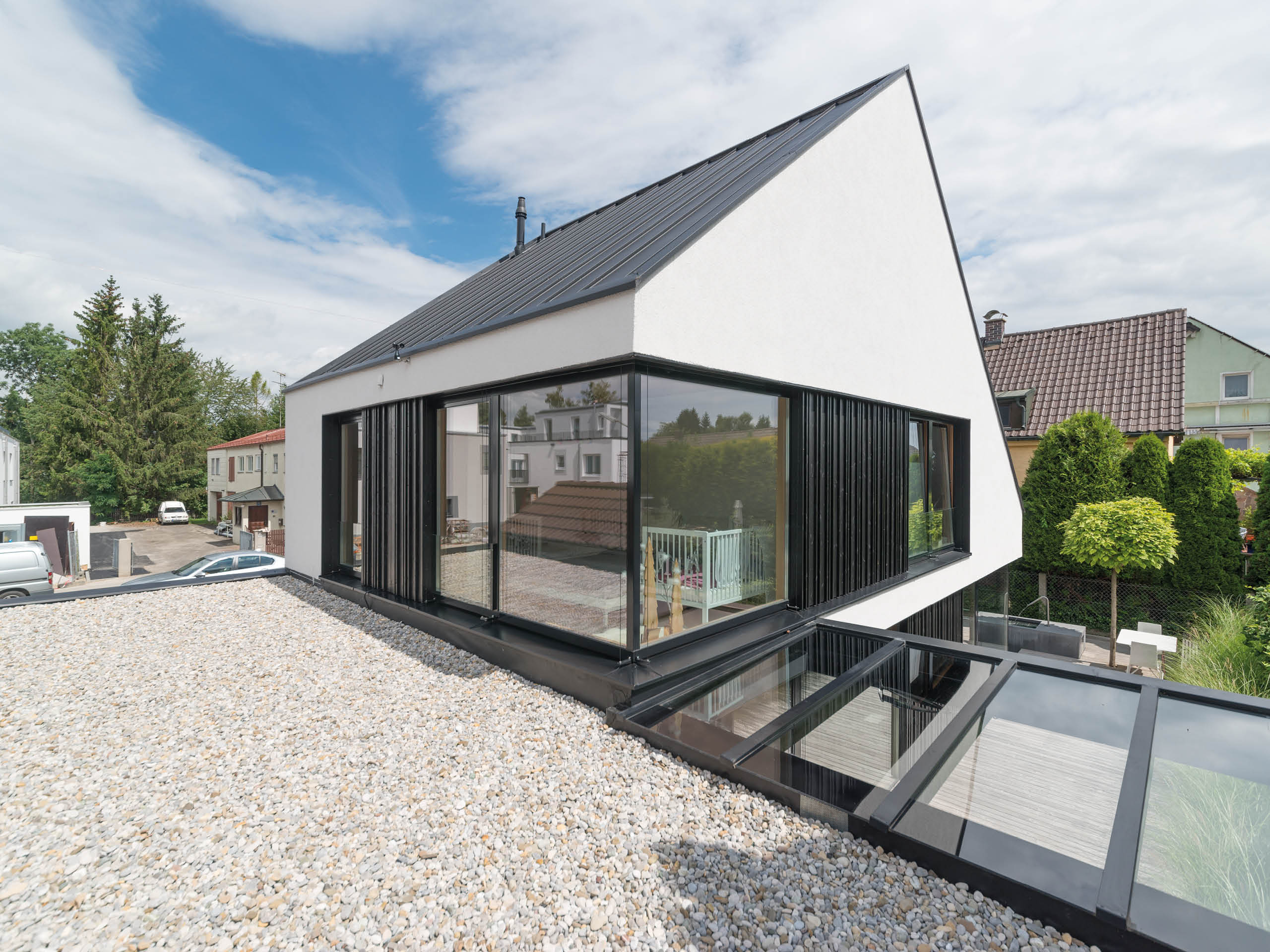 Dieses außergewöhnliche Stadthaus bietet vier Personen auf nur 256m² Grundstücksfläche überraschend viel Platz zum Wohnen, Leben und Arbeiten. Eine zentrale Rolle spielt dabei die Absenkung des Baukörpers um 40 cm, wodurch ein drittes Geschoss realisiert werden konnte.