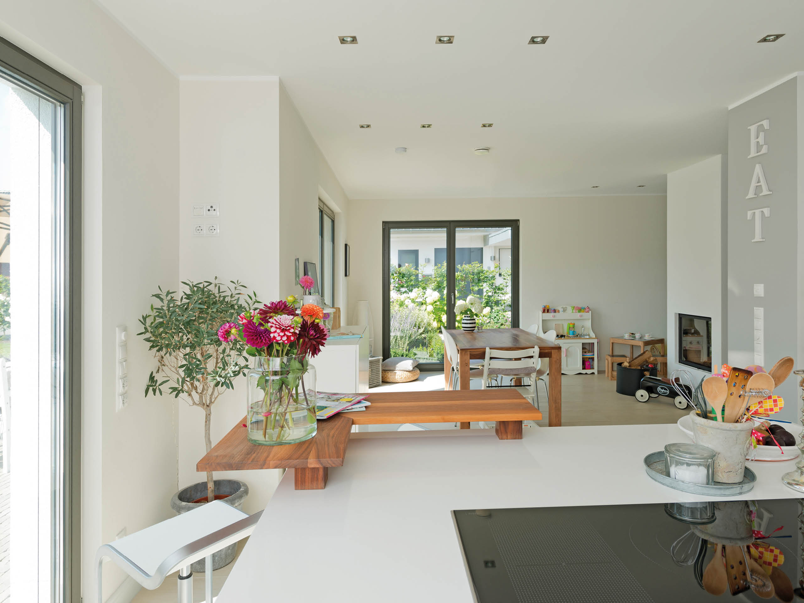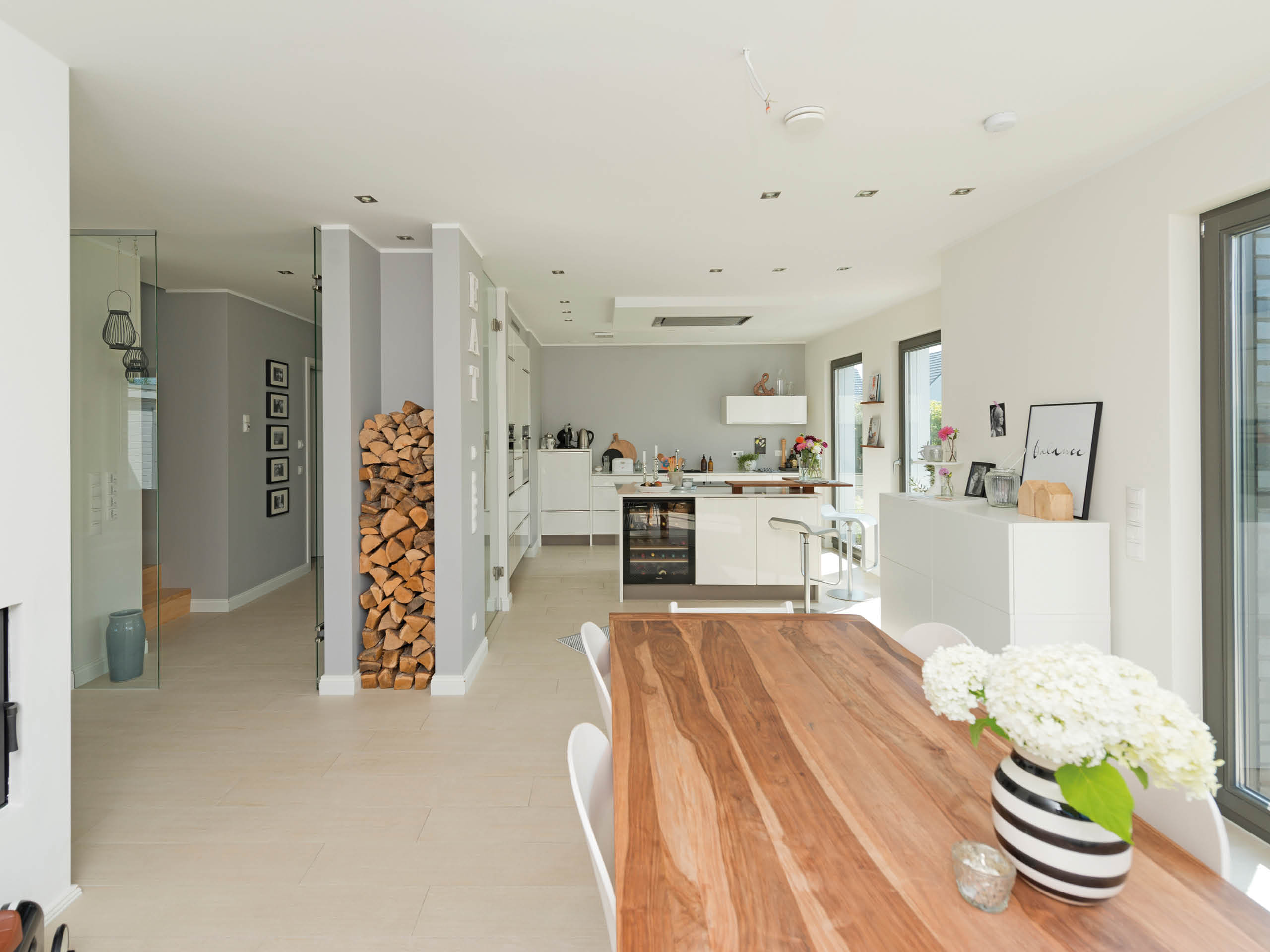 Im Eingangsbereich werden Besucher und Bewohner von einer hellen Diele empfangen, welche dann über eine stilvolle Glastür ins Wohnzimmer einlädt. Die Besonderheit des großzügigen Raumprogramms für vier Personen ist die wohltuende Distanz zwischen Arbeits- und Entspannungsbereich. So ist beispielsweise die Küche vom Wohnbereich aus nicht zu sehen, erlaubt aber dennoch ein geselliges Kochen mit Familie oder Freunden. Zentrum des Raumensembles bildet ein von beiden Seiten einsehbarer Kaminofen, welcher der Wohnnische ein gemütliches und stimmiges Ambiente verleiht.