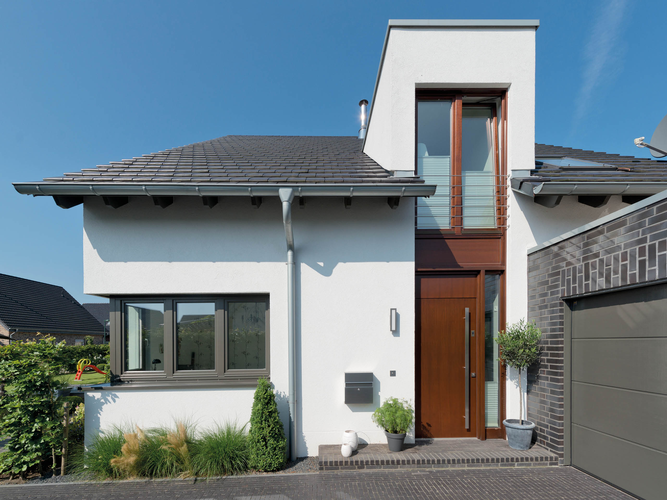Die charakteristische Zweiteilung der Fassade springt sofort ins Auge. Sie ist nicht nur durch einen Fassadenrücksprung, sondern auch durch die Wahl zweier kontrastreicher Materialien ausgeprägt, welche die typisch-nordische Klinkerfassade auf moderne Weise zitieren.