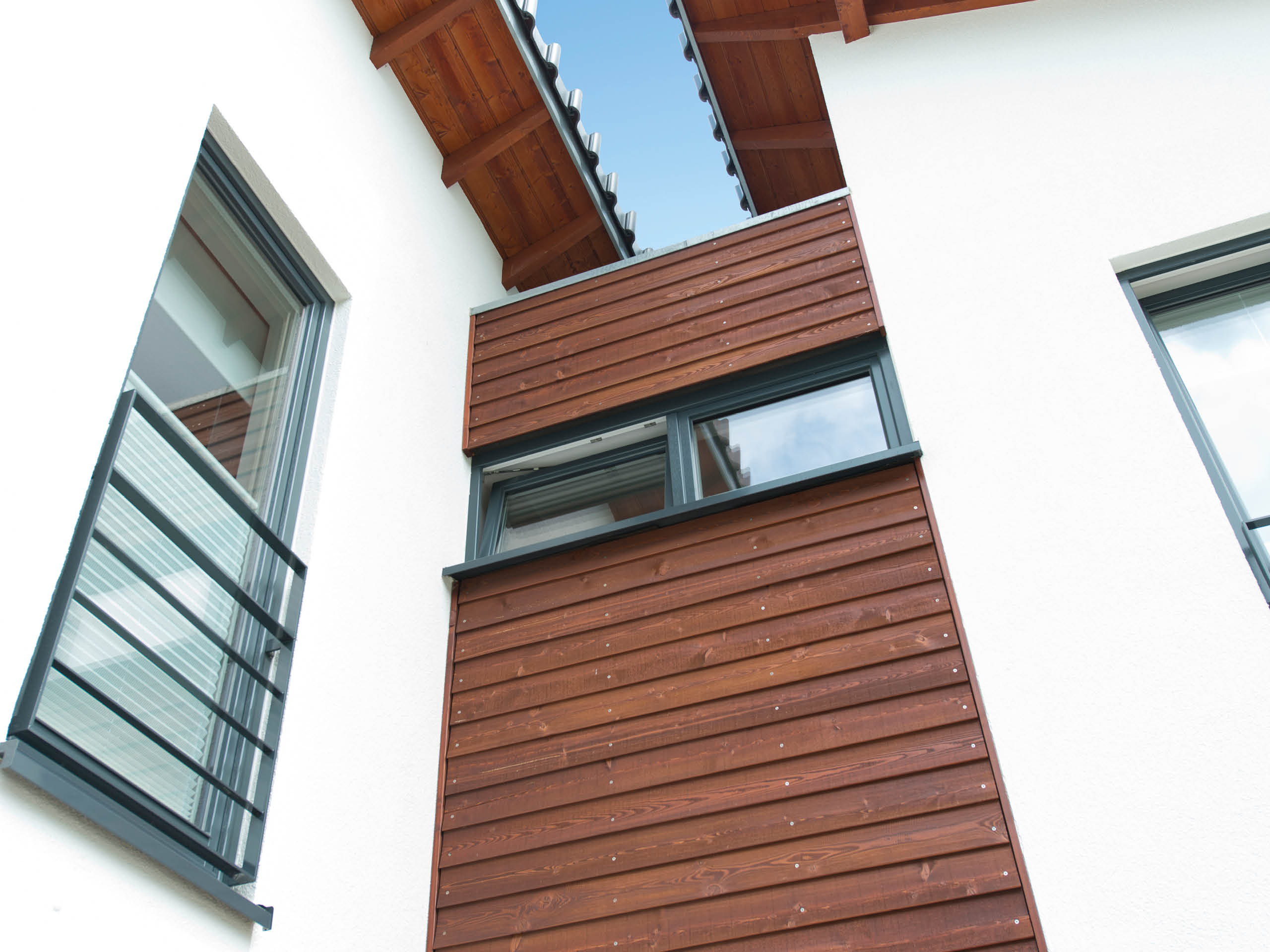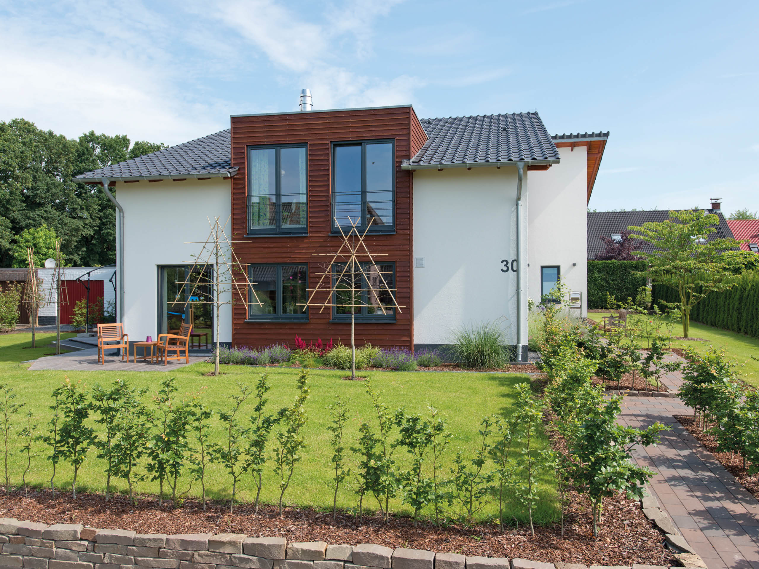Die Wohnung der jüngeren Generation zeichnet sich durch einen gemütlichen und verwinkelten Wohnbereich aus, während sich die Eltern lange Blickachsen bis in die Diele wünschten. Sie gönnten sich außerdem ein großes und luxuriöses Wohnbad, wohingegen Tochter Silke und ihr Ehemann mehr Wert auf zwei große Kinderzimmer legten. Für die Baufamilien wird eine gemeinsame Terrasse zum sonnigen Treffpunkt, jedoch sind beide Haushälften auch mit einem jeweils eigenen Freisitz ausgestattet. Hier gelingt die perfekte Mischung aus Gemeinsamkeit und Privatsphäre. Beide Familien sind sich einig: „Wir möchten möglichst nachhaltig und energieoptimiert leben – und auch so bauen.“