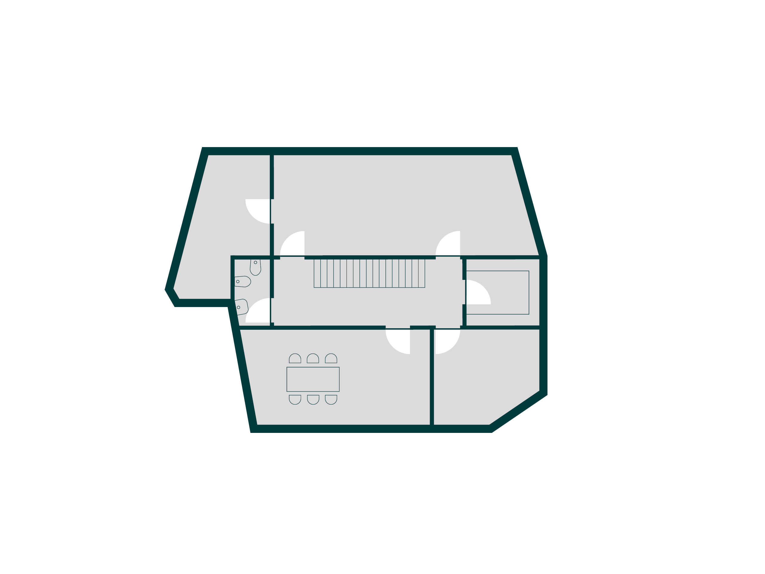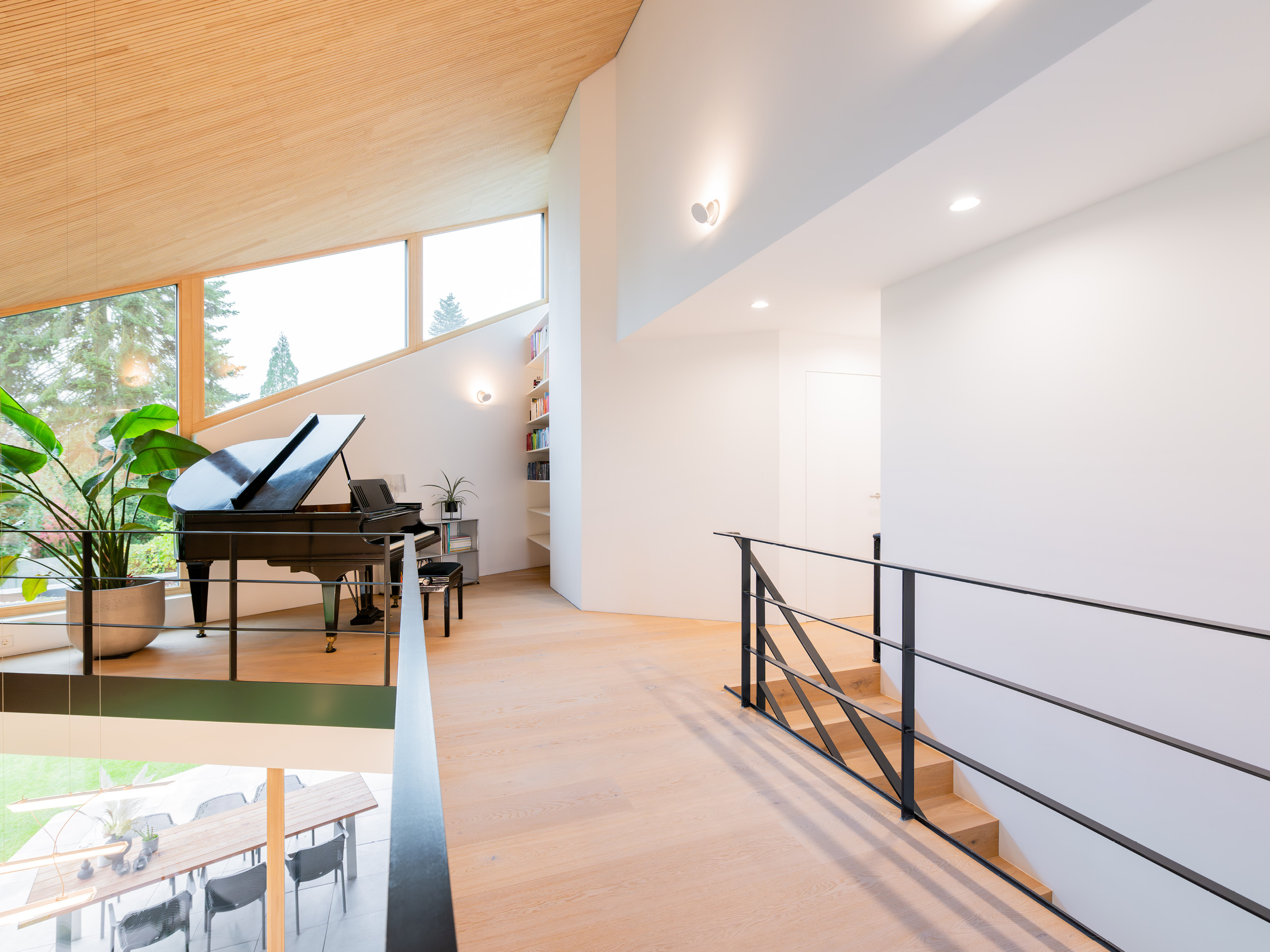 Das Piano auf der großzügigen Galerie im Obergeschoss war schon im Grundriss verzeichnet, bevor es überhaupt gekauft war. Damit wurde auch die Akustik von Anfang an ein wichtiges Thema. Es wurde eine Holzakustikdecke verbaut, die trotz der ansonsten schallharten Oberflächen, wie Betonboden und glatten Wänden, einen dröhnenden Schall verhindert und auch im Erdgeschoss für angenehmen Gesprächsatmosphäre in geselligen Runden sorgt.