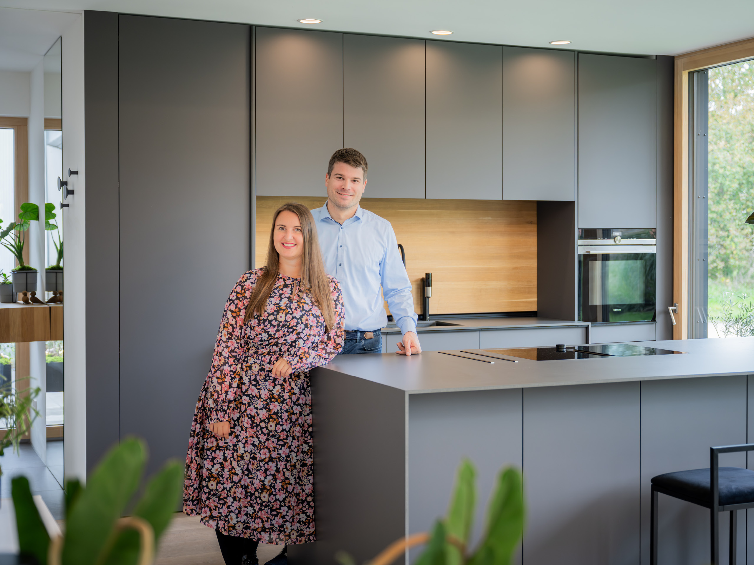 Ansonsten ist das Haus energetisch auf dem aktuell besten Stand: Mit den Tiefenbohrungen wird das Haus mit Erdwärme über eine Wärmepumpe versorgt. Die PV-Anlage mit Batteriespeicher und intelligenter Steuerung wandelt den Energieüberschuss in Warmwasser um. „Somit hat man verschwindend geringe Unterhaltskosten für das Haus und man kann trotzdem noch zwei E-Autos laden“, freut sich der Bauherr.