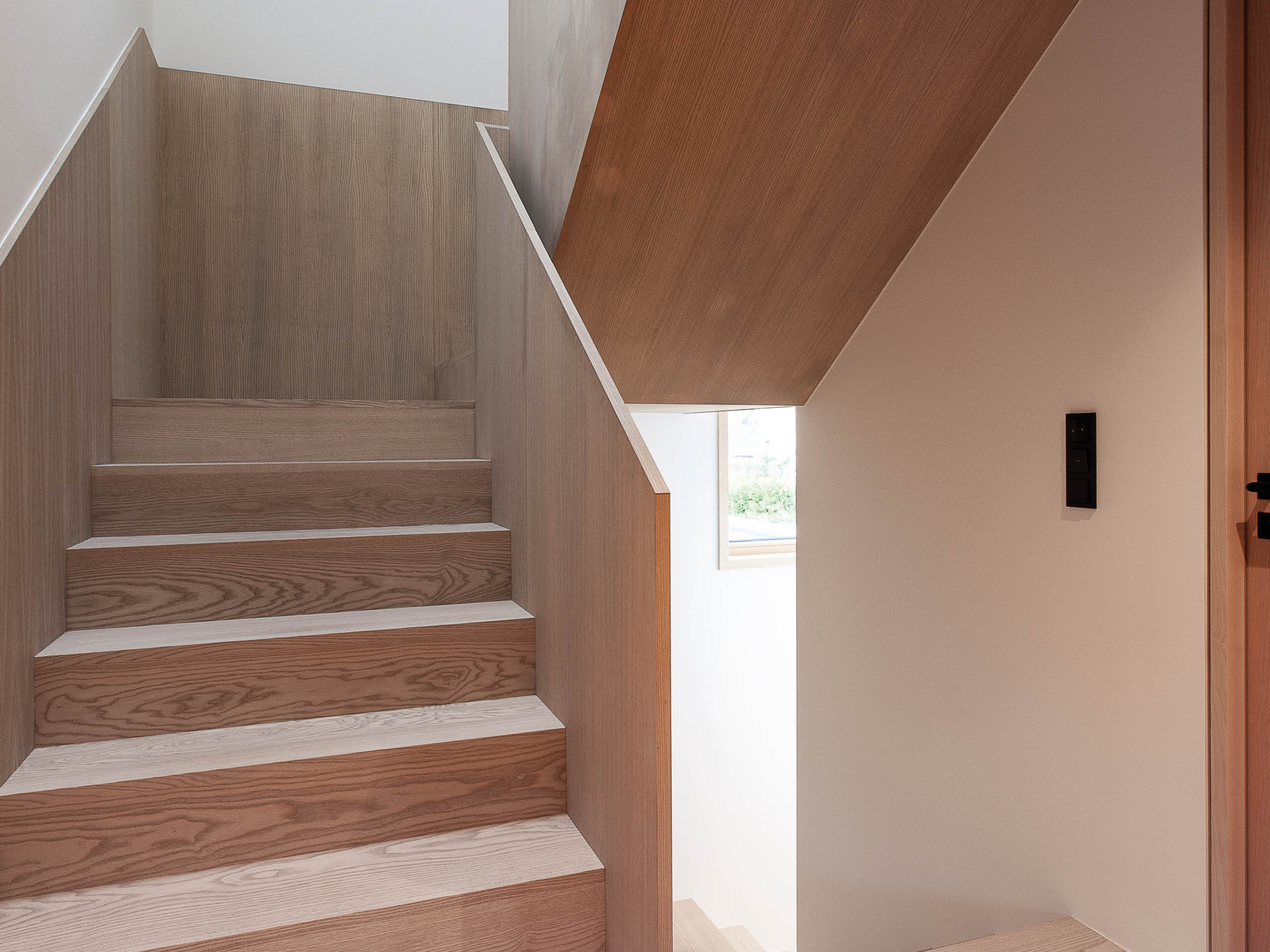 Schlicht und schwarz sollte es sein, da waren sich die Familien einig. Helle Lärchenfenster ergänzen dabei die dunklen Fassaden. Dieser Kontrast wurde im Inneren gekonnt umgekehrt, wo dunkle Flächen Akzente im ansonsten naturfarbenen Interieur bilden. Die Funktionsbereiche gliedern sich in Essbereich und Küche im Erdgeschoss, Schlafplätze im Obergeschoss und Arbeits- und Hobbyräume im Dachgeschoss. Kein Wunder, dass die Baufamilien so zufrieden sind: „Unser Traum vom stilvollen Wohnensemble ist auf ganzer Linie wahr geworden.“