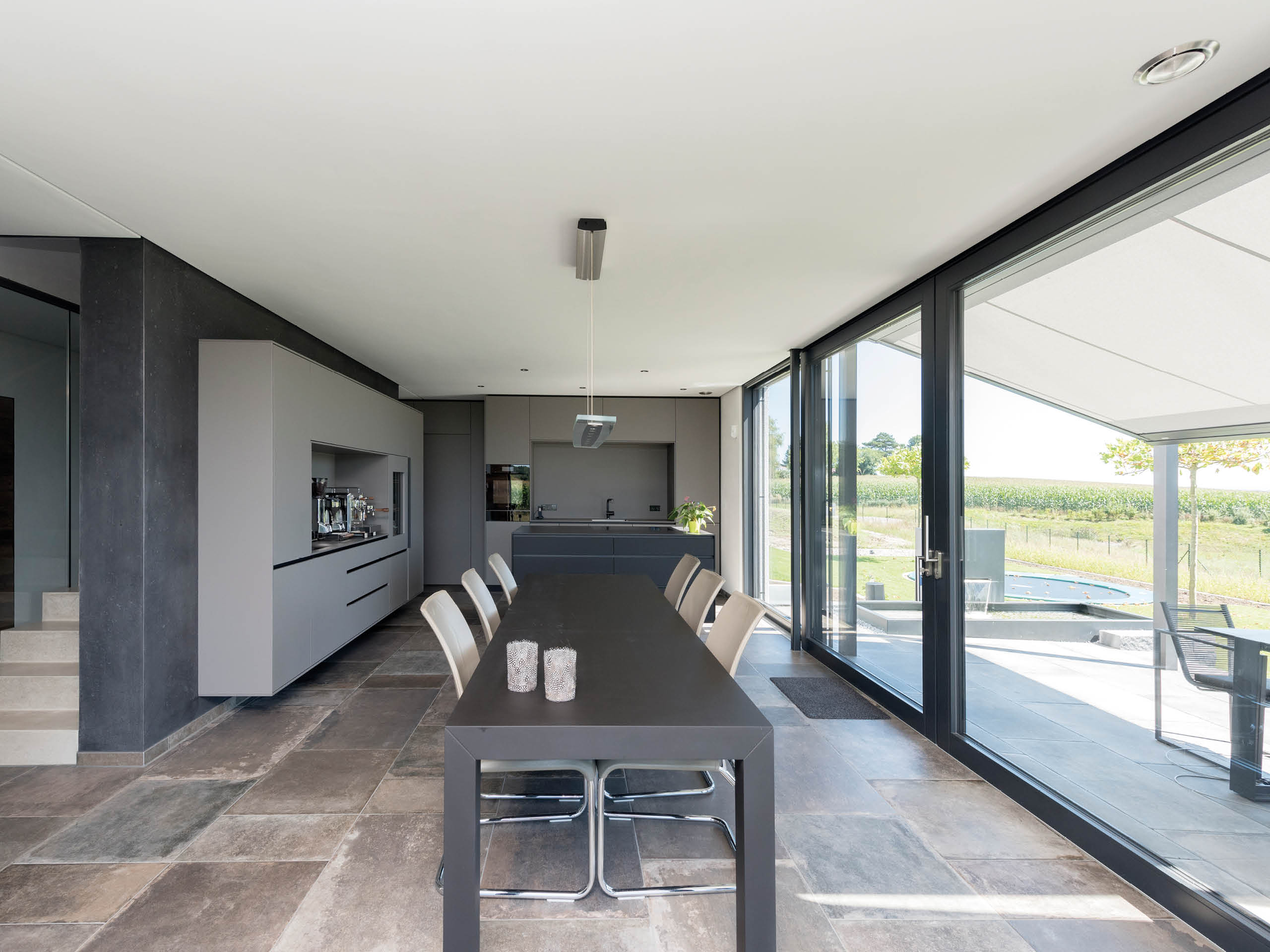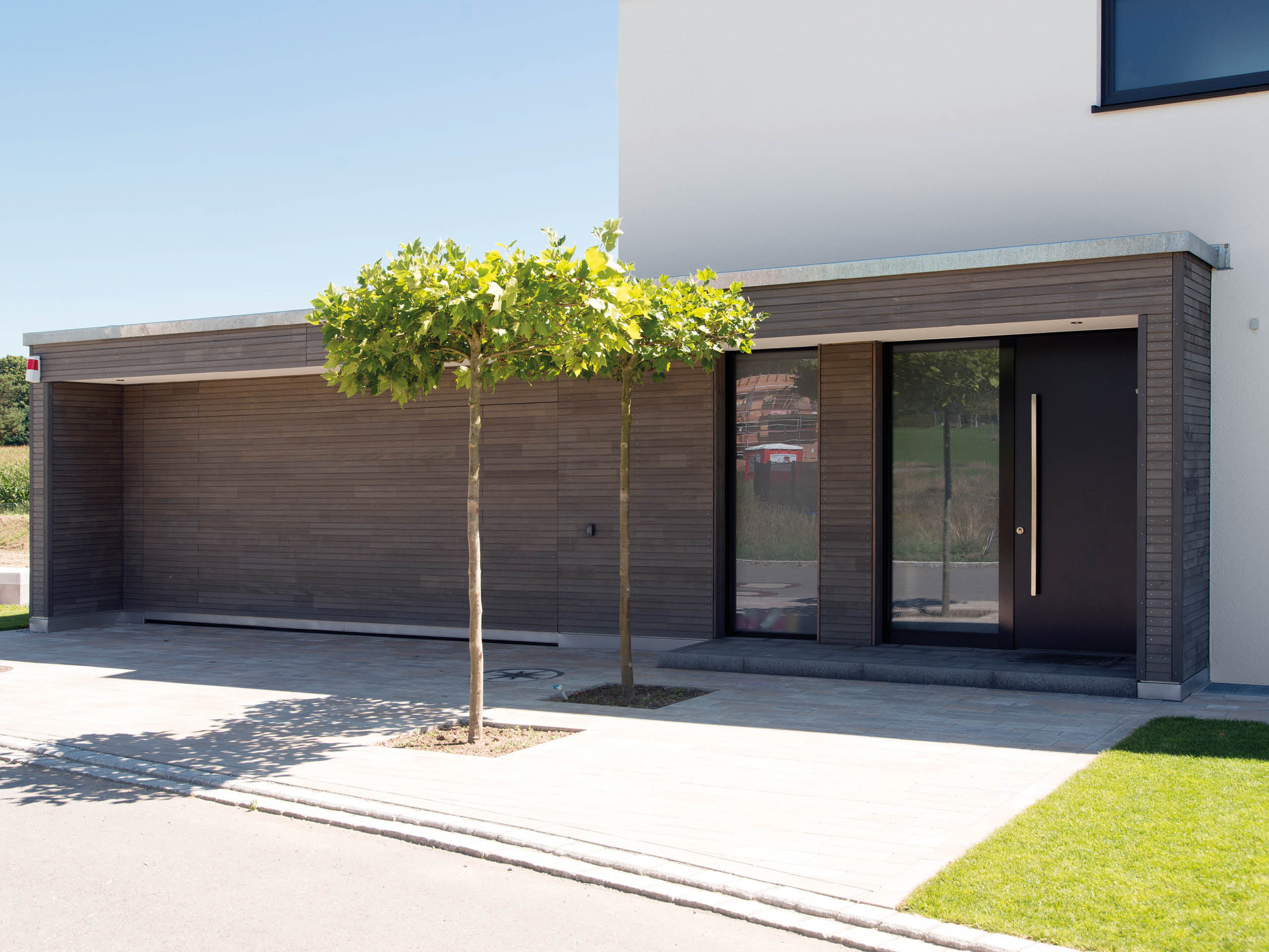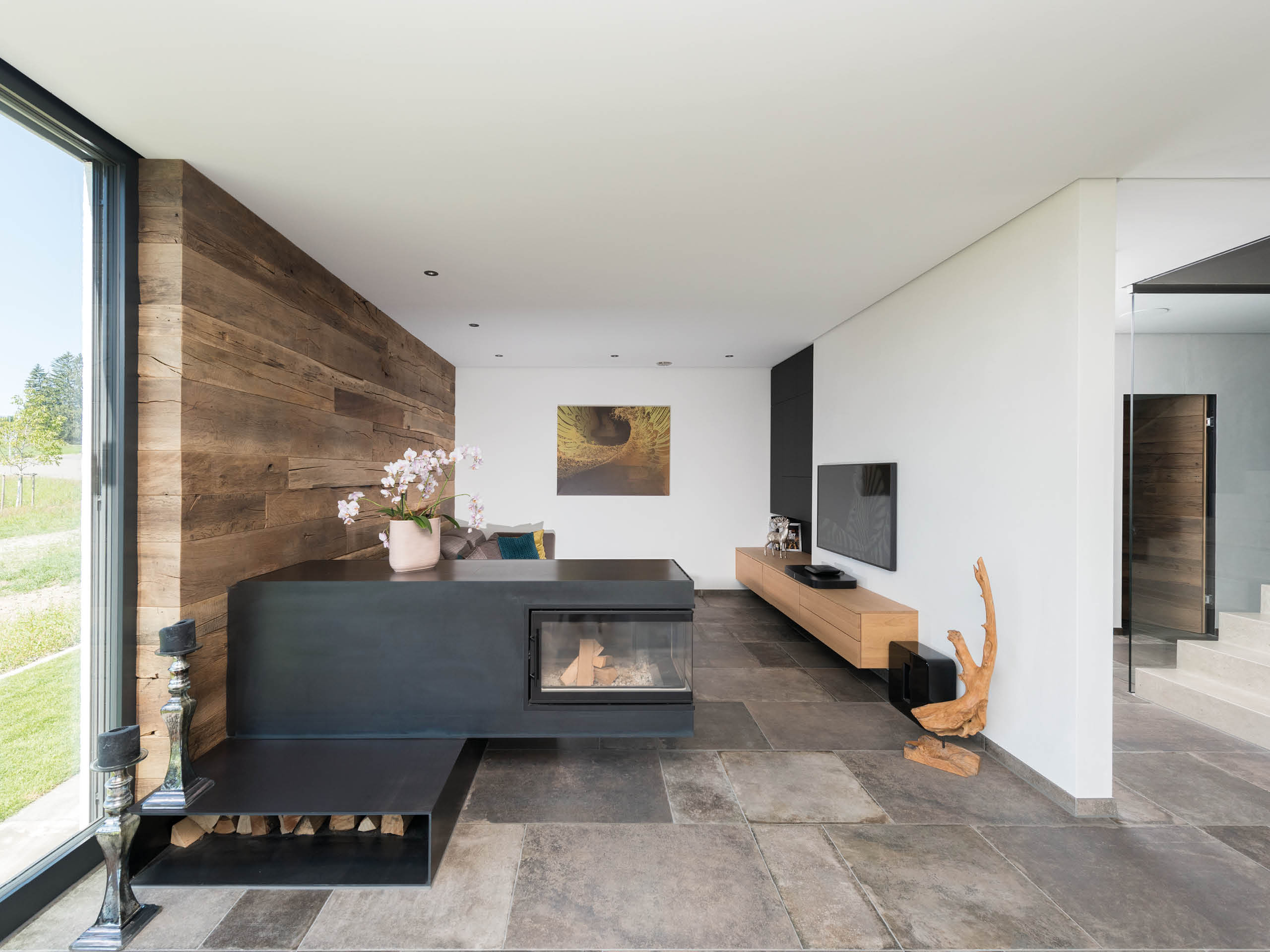 Die klare Linienführung des symmetrischen Baukörpers wird äußerlich durch einen gut geschützten Freisitz im Außeneck des Obergeschosses aufgelockert. Beim Eintreten lädt eine ansprechende Mischung aus Erdtönen, Eichenholz, Sichtbeton und schwarzen Flächen zum Genießen und Entspannen ein. Unterstützt wird dieses edle Raumgefühl durch ein angenehmes Raumklima vom Obergeschoss bis in den Keller ‒ letzterer hält einen besonderen Vorteil für den Bauherren bereit: „Ich bin Weinliebhaber und genieße es, dass ich Rot und Weiß im Keller perfekt temperieren kann.“