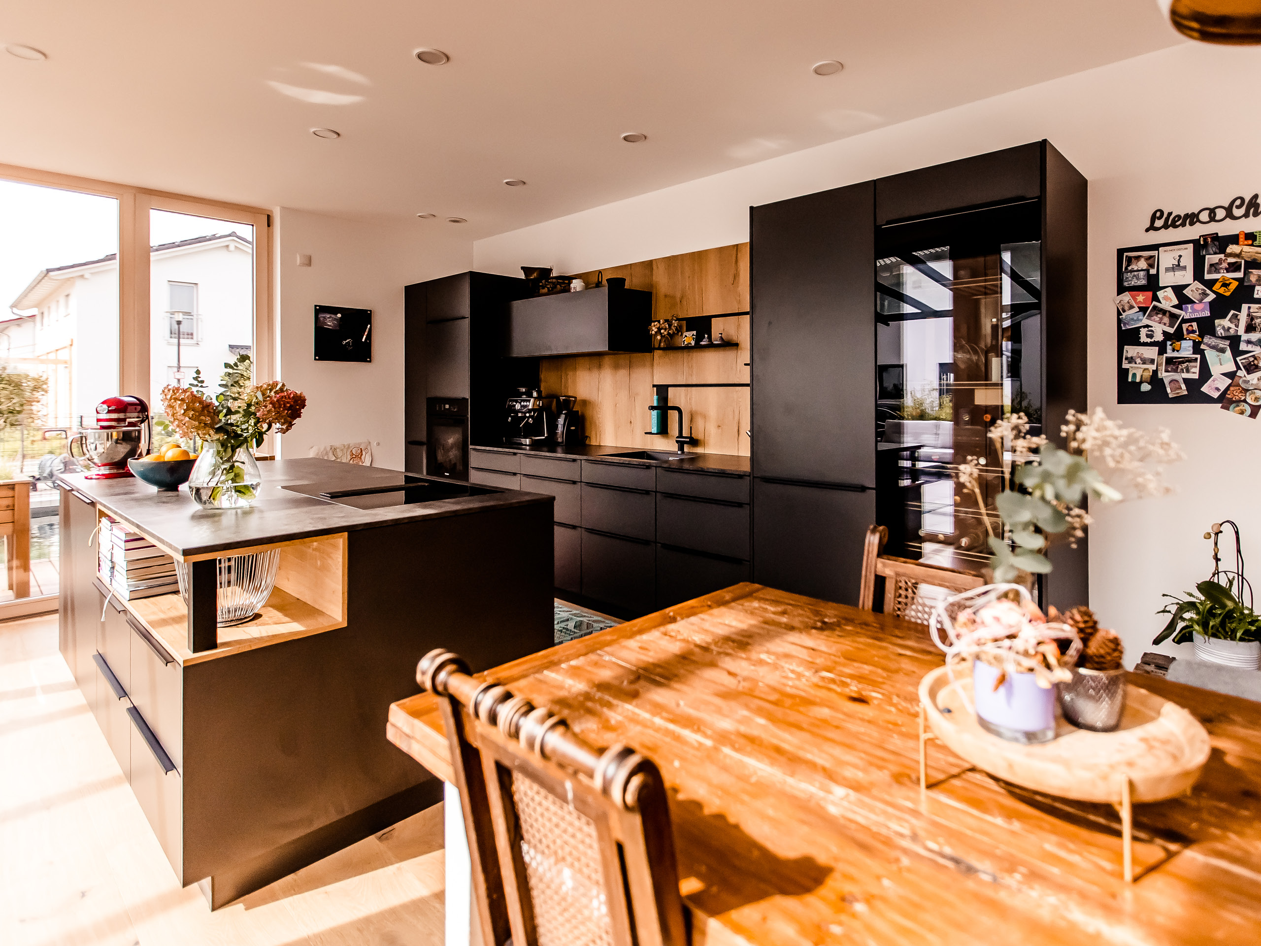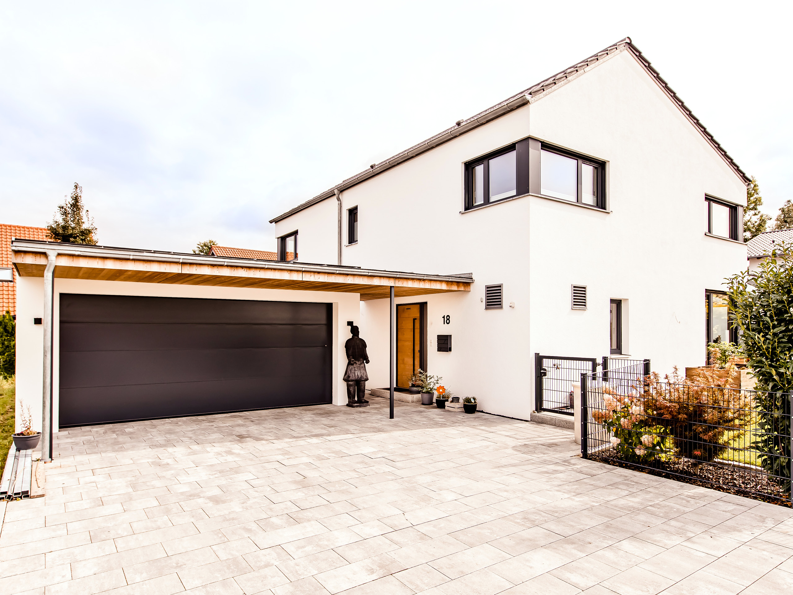 Die Kombination aus biologischer Holzbauweise und modernem Design macht dieses Einfamilienhaus zum nachhaltigen Rückzugsort mit Stil. Beeindruckende Details wie die Lärchen-Rhombus-Fassade des Anbaus mit Flachdach und das große Sitzfenster im Wohnzimmer dienen als Eyecatcher, genauso wie die HPL-Fassadenplatten an den Fenstern. Auch der überdachte Zugang zur Garage ist nicht nur funktional, sondern fügt sich optisch perfekt in den Baukörper ein. Das rundum nachhaltige und energieeffiziente Bauen war der Baufamilie sehr wichtig, weshalb sich nicht nur außen Details aus Holz finden, sondern auch im Inneren: Eine imposante Wangentreppe, die Haustür aus astiger Eiche sowie die Holztüren der Wohnräume. Ein weiterer Ort des Komforts und Wohlbefindens ist die Terrasse mit Glasüberdachung. Diese bietet eine elegante und moderne Lösung, um den Außenbereich bei jedem Wetter nutzen zu können. Sie schützt vor Regen und Wind, lässt dabei aber viel Licht hindurch, sodass ein heller und freundlicher Raum im Freien entsteht.