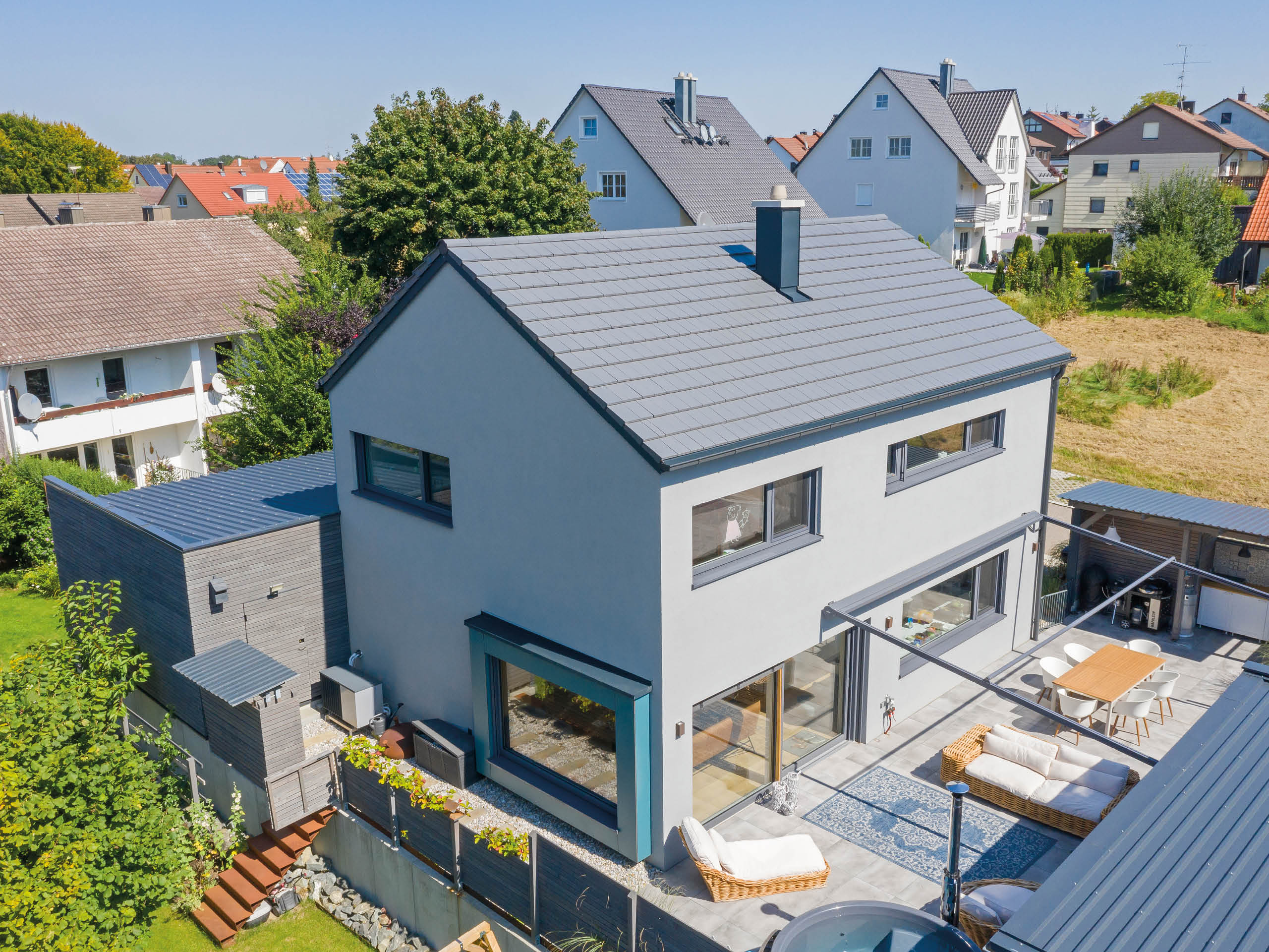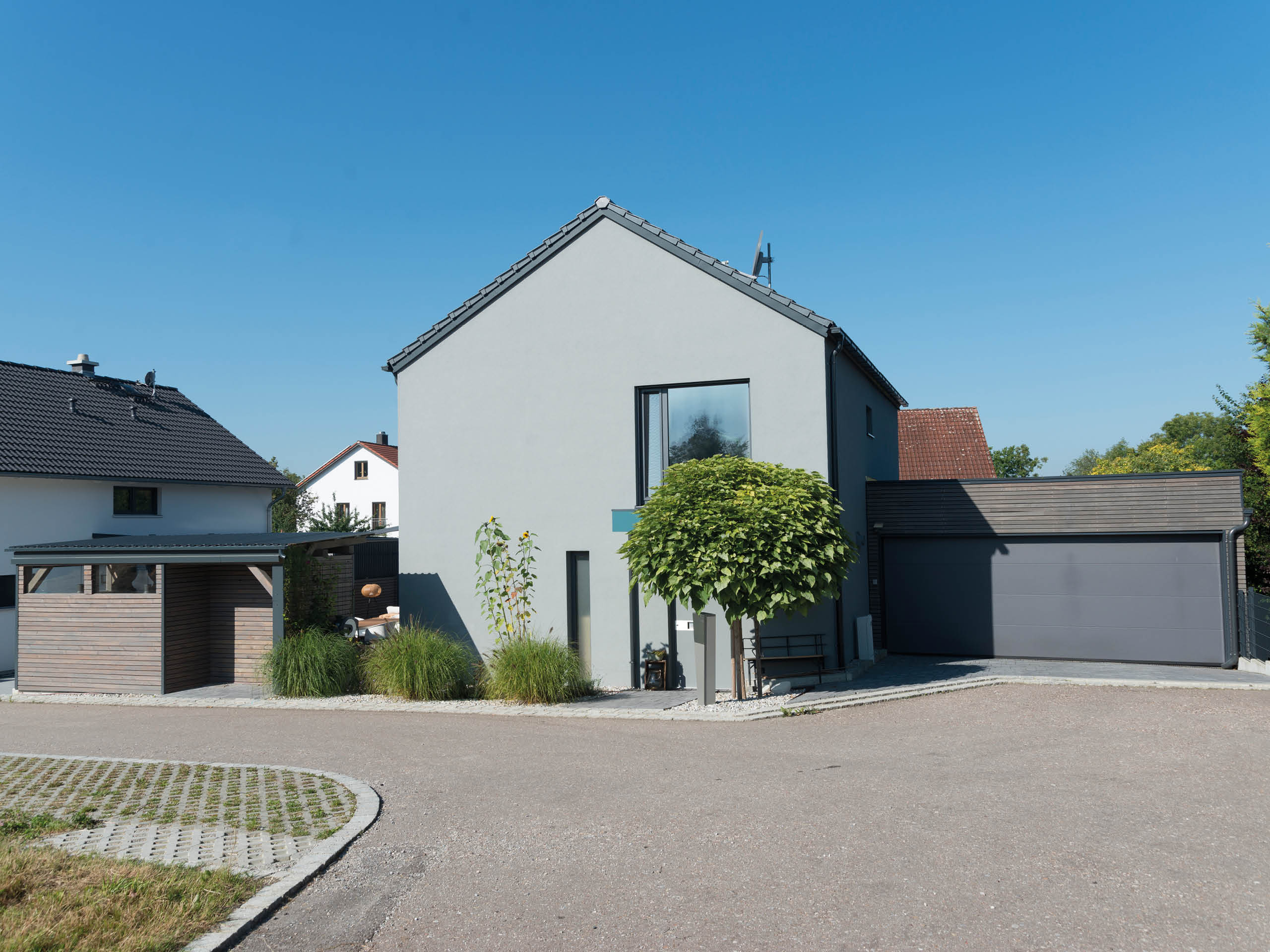 Der kompakte Baukörper holt ein Maximum an Wohnkomfort aus dem schmalen Grundstück heraus. Dies gelang unter anderem dank minutiöser Planung von Bauherr Alexander Seidel, welcher selbst intensiv an der Reduktion der Verkehrsflächen gearbeitet hatte. Der Feinschliff des Entwurfs wurde dann im Dialog mit der ZimmerMeisterHaus-Manufaktur herausgearbeitet.