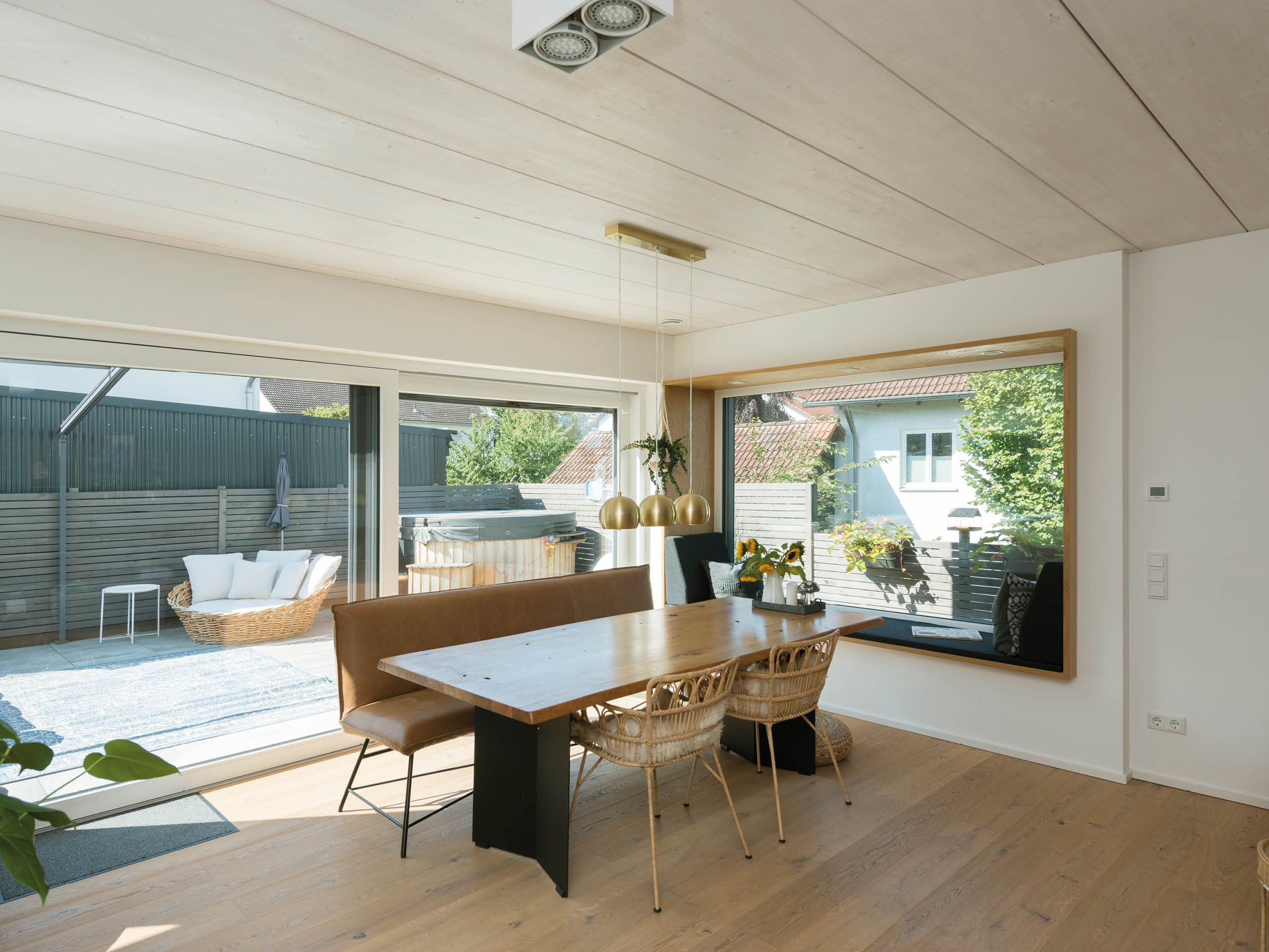 Beim Betreten des Hauses fallen sofort lange Blickachsen und ein offenes Raumgefühl auf, beispielsweise in der geräumigen Küche mit direkter Anbindung an den Wohnbereich. Und obwohl insgesamt drei Bäder Platz gefunden haben ‒ eines davon in den besonders kompakt geplanten Technikraum integriert ‒ konnte die vierköpfige Familie problemlos auf einen Keller verzichten. „Mit durchdachten Lösungen Geld sparen ist für uns möglich geworden, ohne Individualität einzubüßen“, erinnern sich die Seidels.