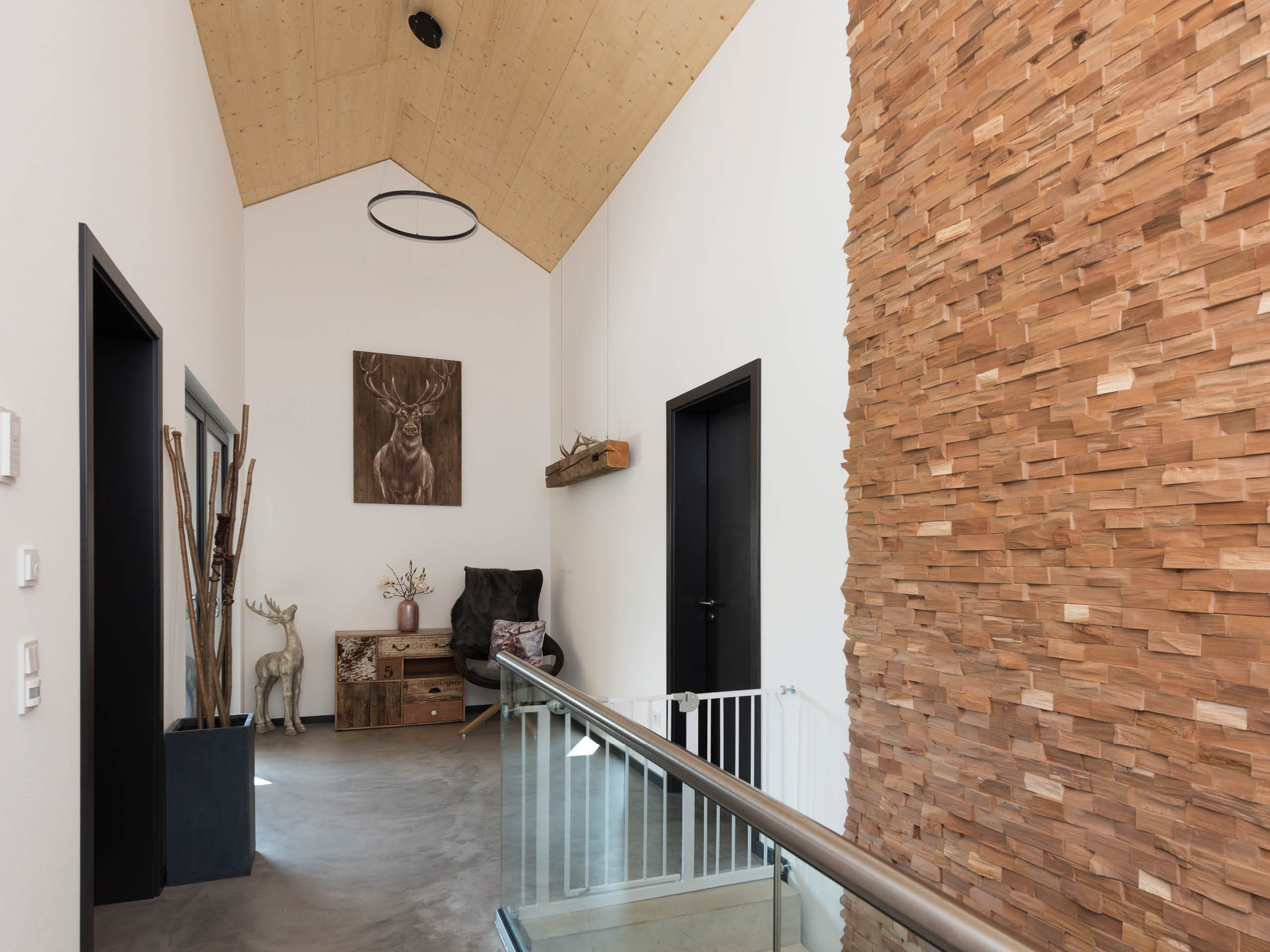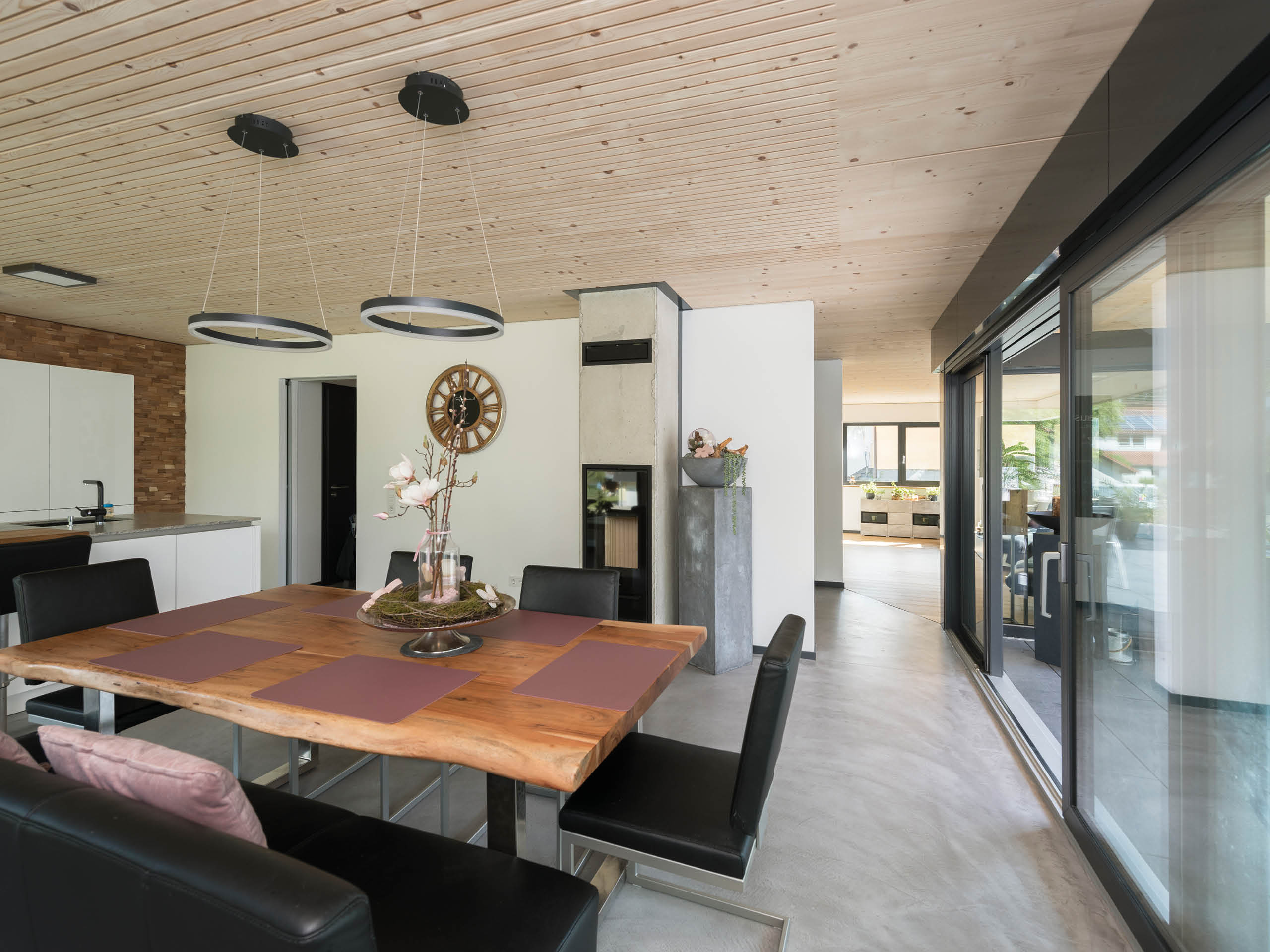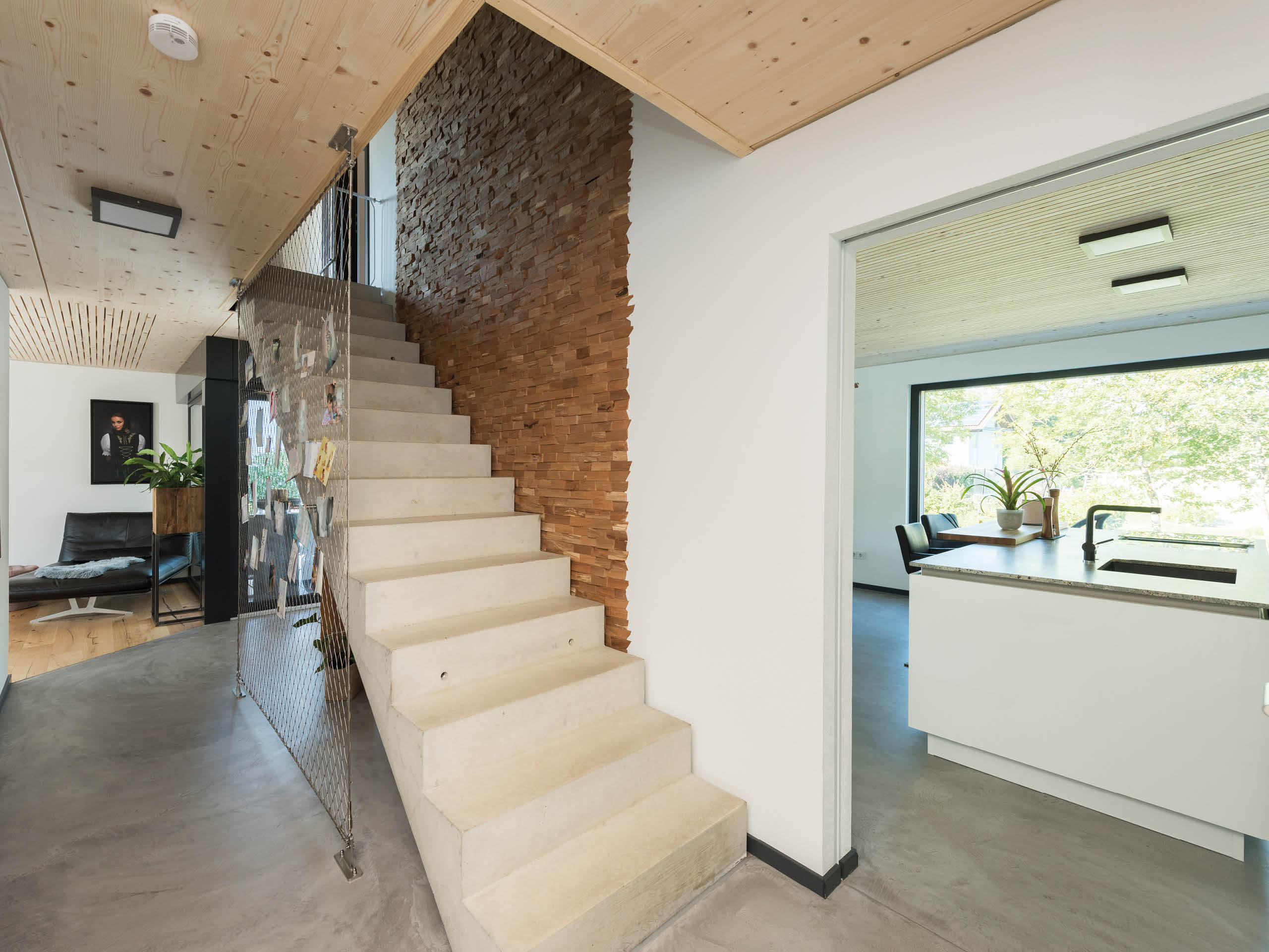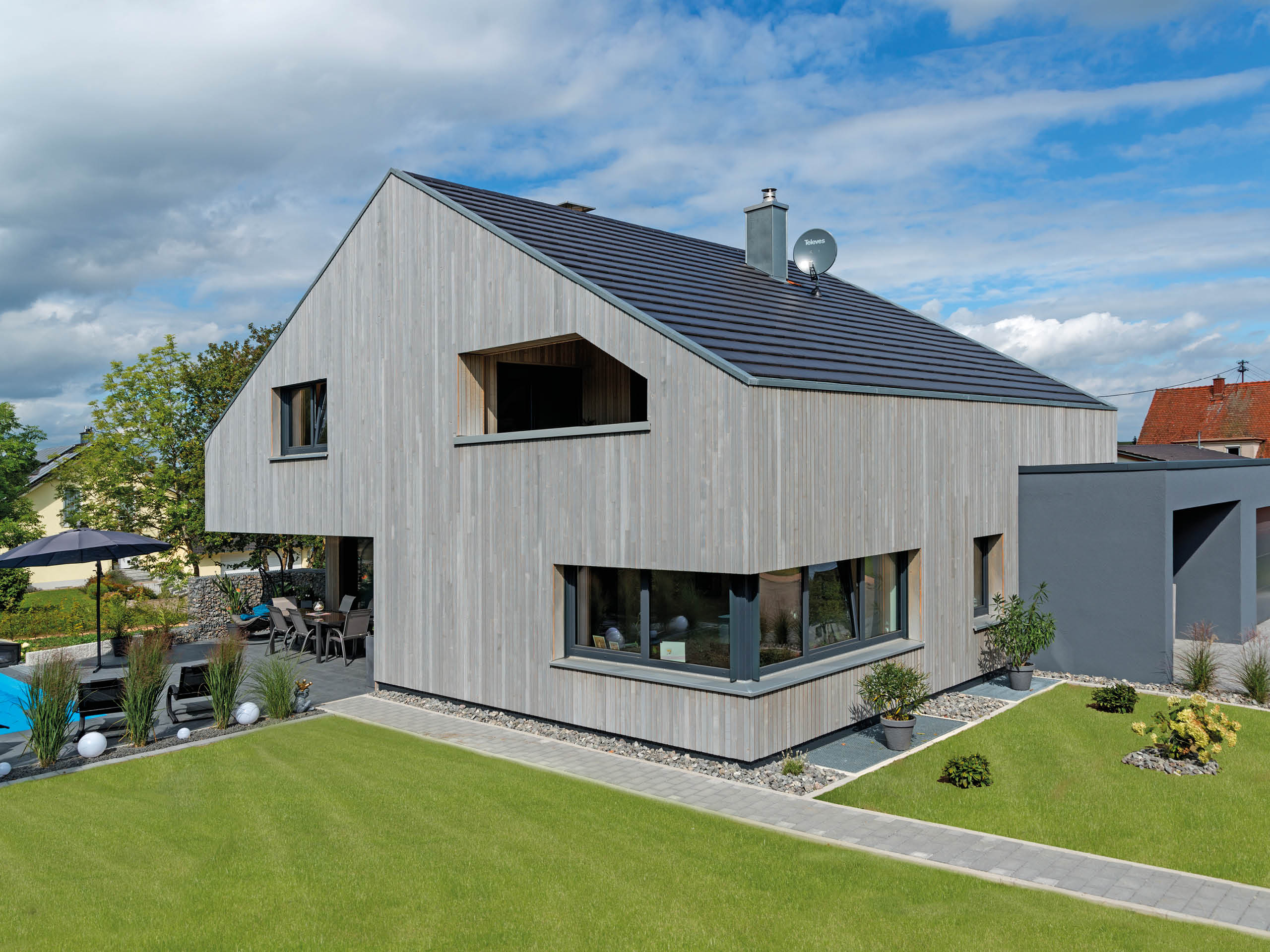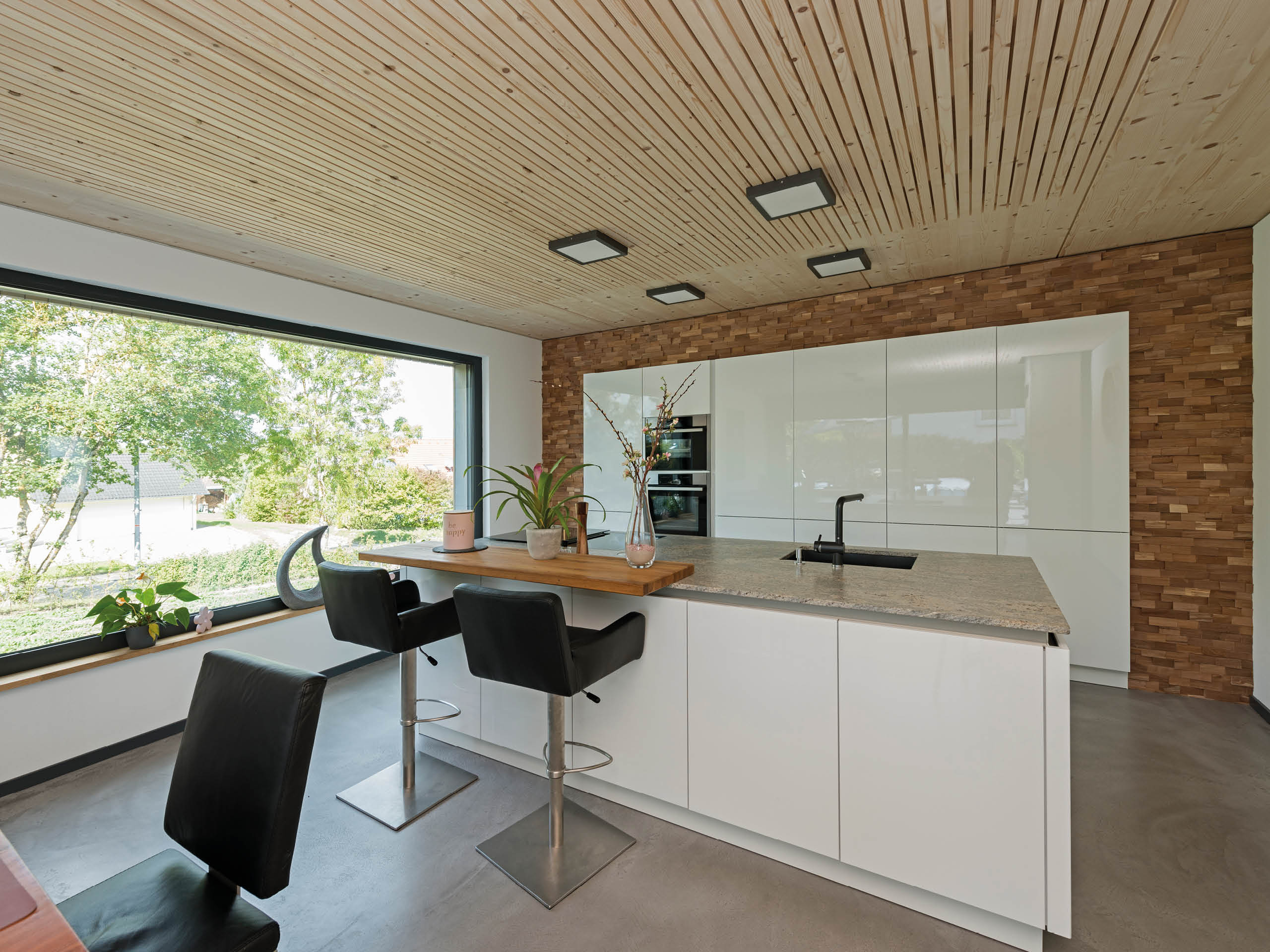 Bereits auf den ersten Blick ist das überstandslose Dach ein Alleinstellungsmerkmal im Siedlungsgebiet. Auch die großen Glasflächen tragen zu einer besonders zeitgemäßen Optik bei und sorgen gemeinsam mit der naturfarbenen Massivholzdecke für ein helles Ambiente im Hausinneren. Konzipiert für fünf Personen beinhaltet das Raumprogramm neben einem Hobbyraum unter anderem ein komfortables Familienbad mit Sauna und Badewanne. „Hin und wieder…“, so Familie Weymann, „…werden wir sogar von Passanten gebeten, das Haus einmal von innen bestaunen zu dürfen.“