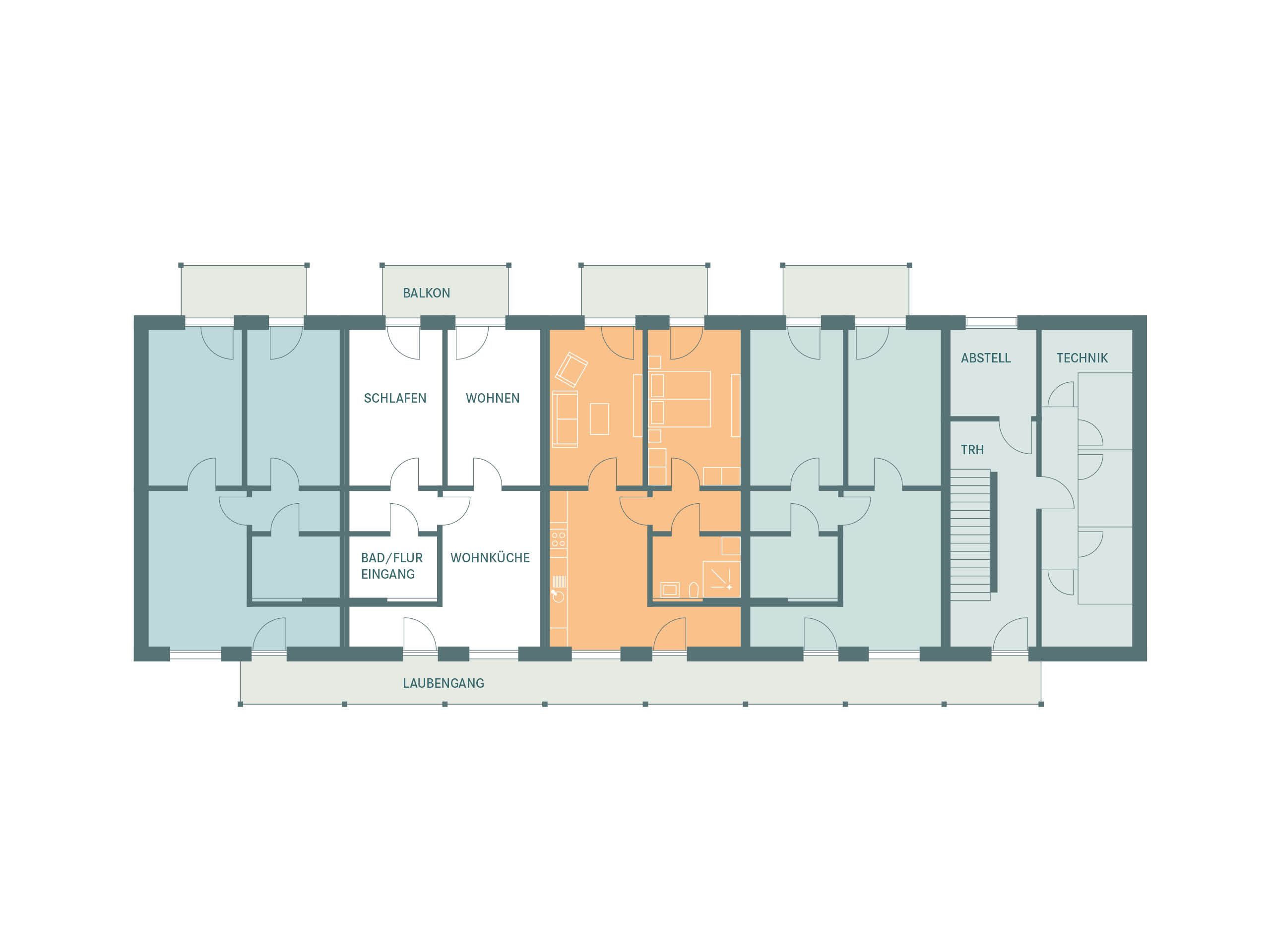 Die kleinste Einheit, eine flexible Raumzelle mal 4, verbindet sich zu einer Wohneinheit. Vier dieser Wohneinheiten in Reihe geschaltet und durch ein Treppenhaus mit gemeinnützigen Funktionen in derselben modularen Ordnung ergänzt ergibt den Grundriss für 3 Etagen. Ein Laubengang zur Erschließung und private Balkone werden als charakterisierende Elemente dazu addiert. Alles zusammen ergibt ein einfaches Ganzes.