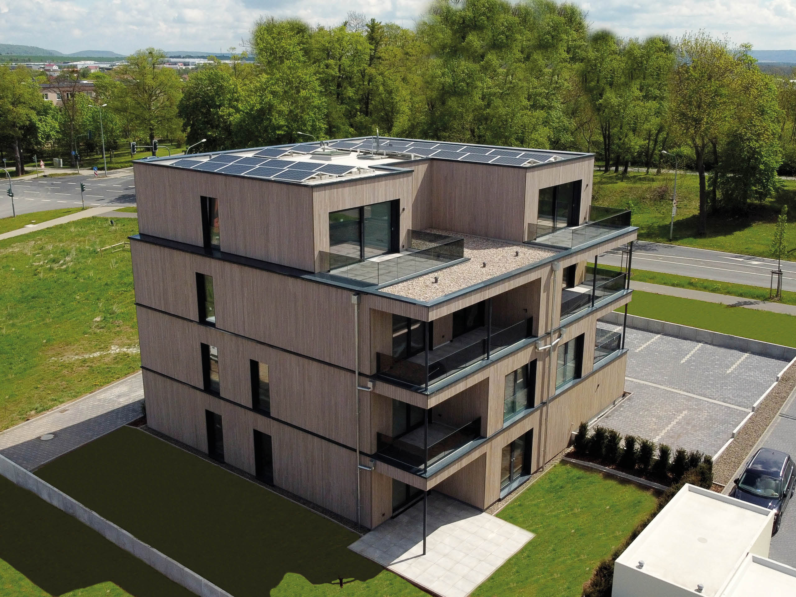 Der mehrgeschossige Wohnungsbau in Holz präsentiert sich in der kubischen Gebäudearchitektur. Eine optimale Nutzung der möglichen Wohneinheiten gemäß Bebauungsplan war das wirtschaftliche Ziel. Bei diesem Projekt ist das ausführende Holzbauunternehmen gleichzeitig der Eigentümer. Durch die besonders hohe werkseitige Vorfertigungstiefe der Wandelemente konnte das Gesamtgebäude in nur neun Monaten schlüsselfertig fertiggestellt werden.