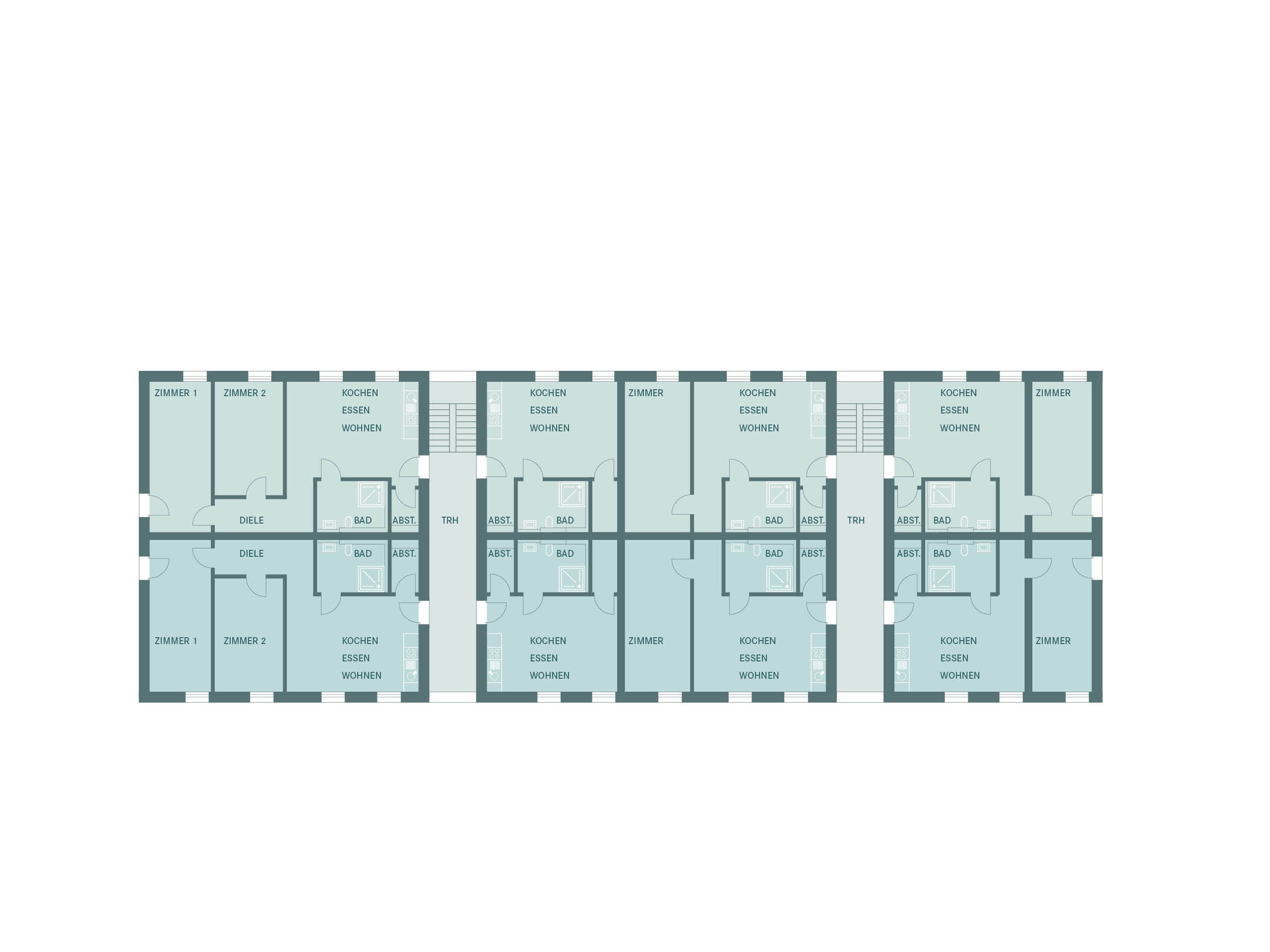 Die 16 Ein-, Zwei- und Dreizimmerwohnungen verteilen sich auf zwei Geschosse und sind mit erhöhten Schallschutzmaßnahmen gegen Außenlärm geschützt. Das Erdgeschoss wurde barrierefrei ausgeführt, um allen Anforderungen gerecht zu werden. Mit der sichtbaren Massivholzdecke spürt man den vorrangig eingesetzten Werkstoff, der sonst innen wie außen unterm Putz verschwindet.