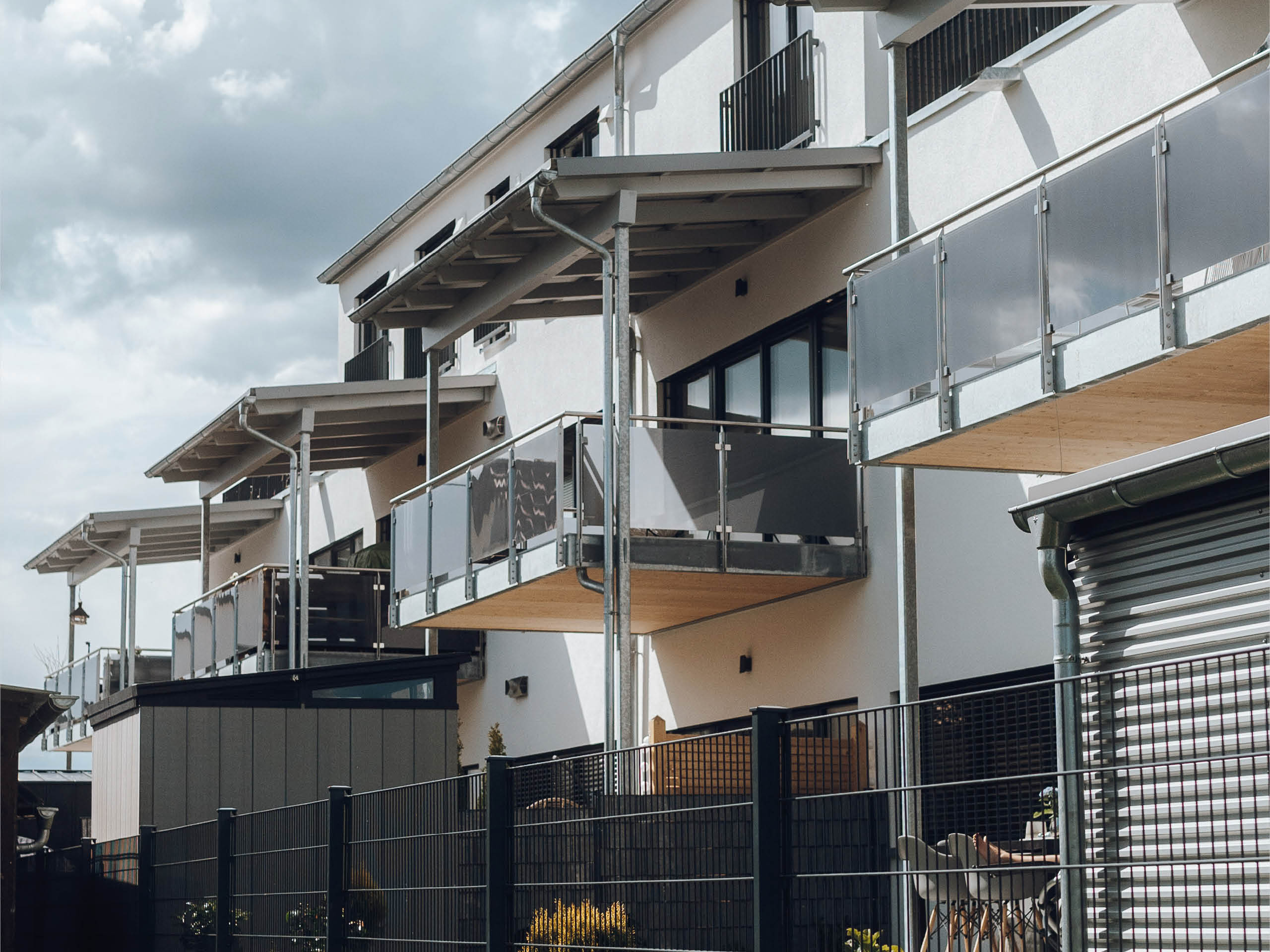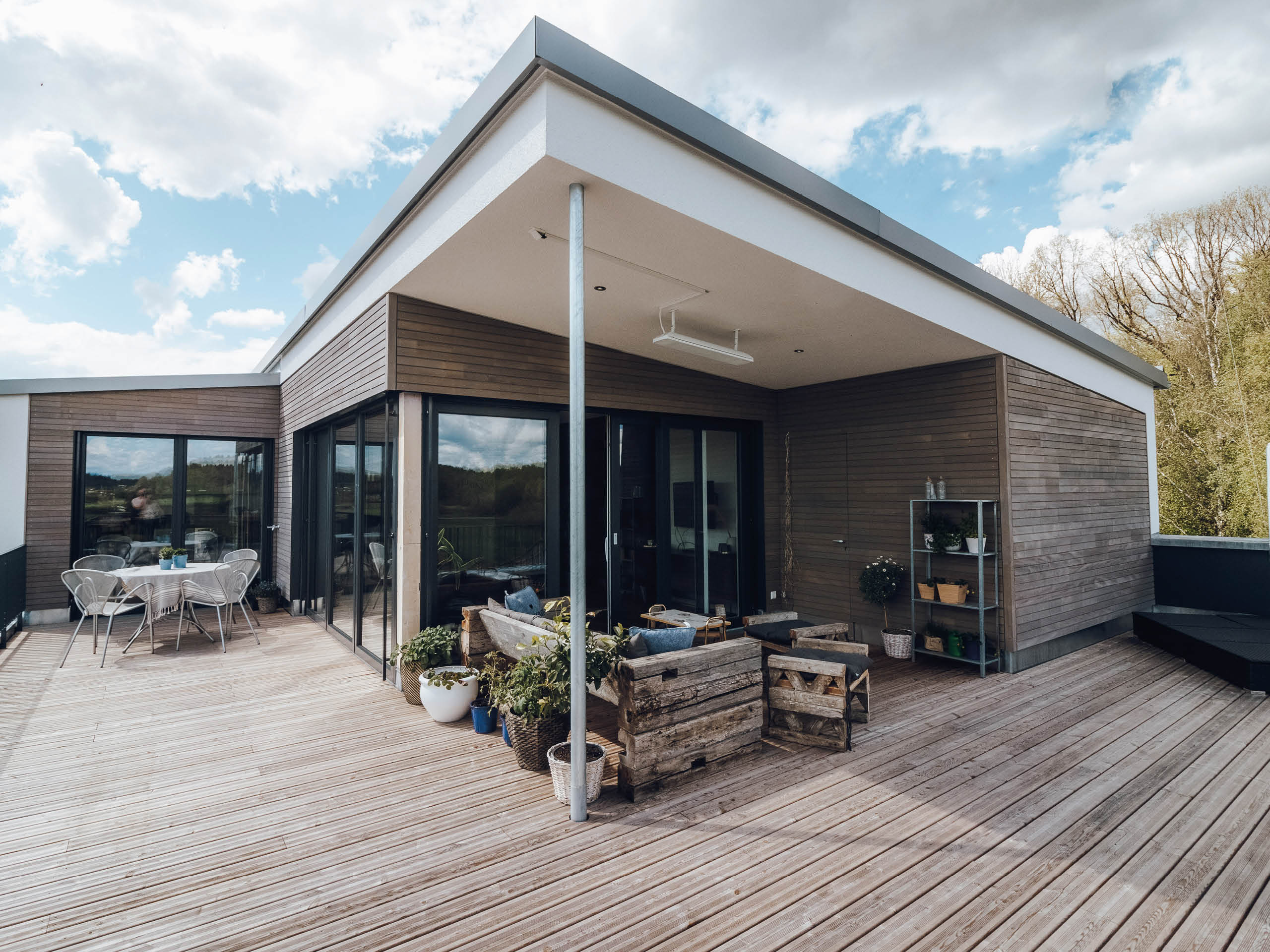 Schon auf den ersten Blick ist das Gebäude optisch sehr attraktiv. Die hinterlüftete Doppelrhombusfassade des Penthouse-Geschosses mit Vollwärmeschutz ist ein echter Hingucker. Das außenliegende Wärmedämmverbundsystem aus ökologischer Holzfaser ermöglicht hier die durchgehende Dämmung ohne Wärmebrücken und nimmt zugleich die Jalousien und Rollläden auf. Über die zentrale, mechanische Lüftungsanlage wird rund um die Uhr der bauphysikalisch benötigte Luftwechsel sichergestellt. Durch die effiziente Wärmerückgewinnung sparen die heutigen Eigentümer entscheidend Energiekosten.